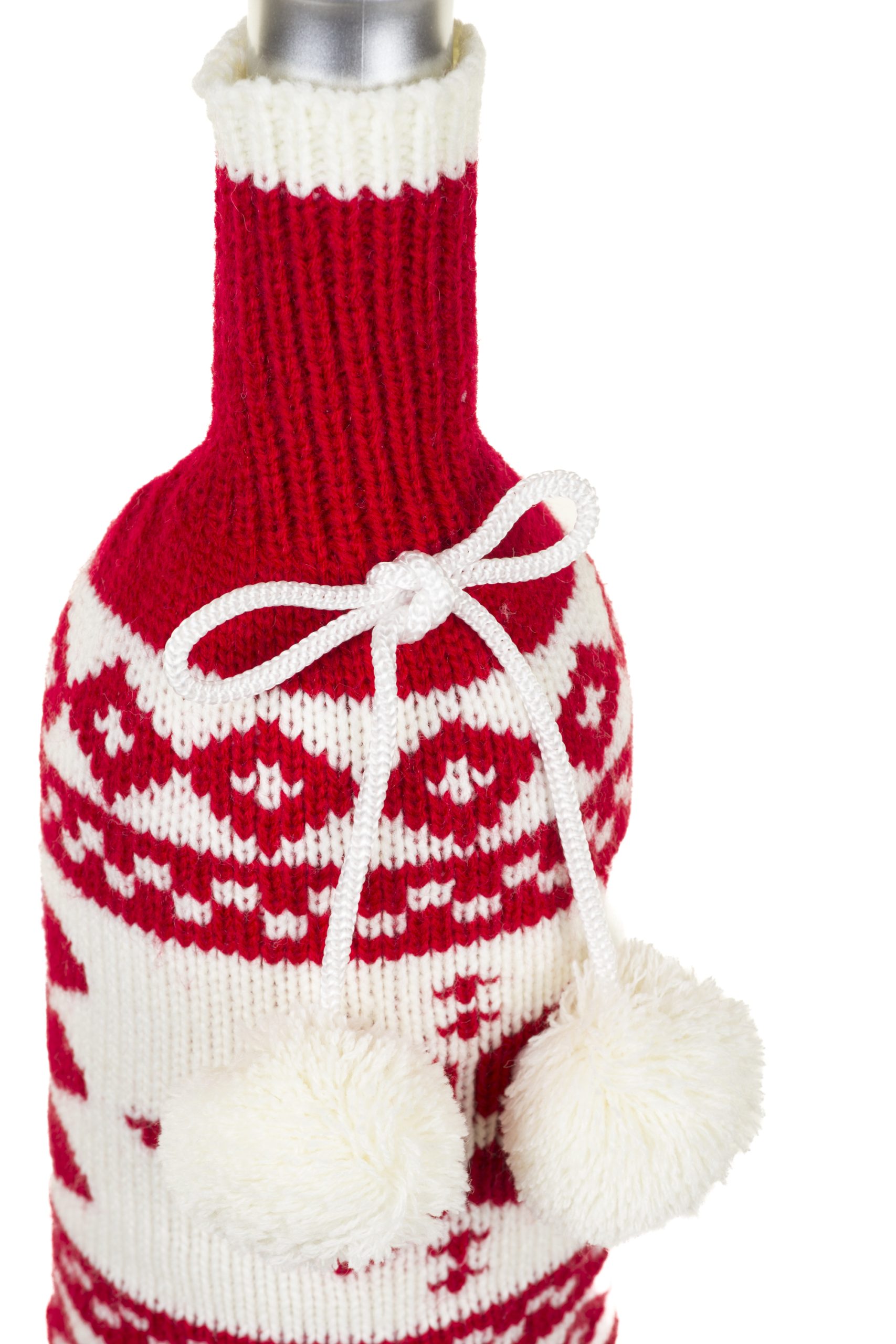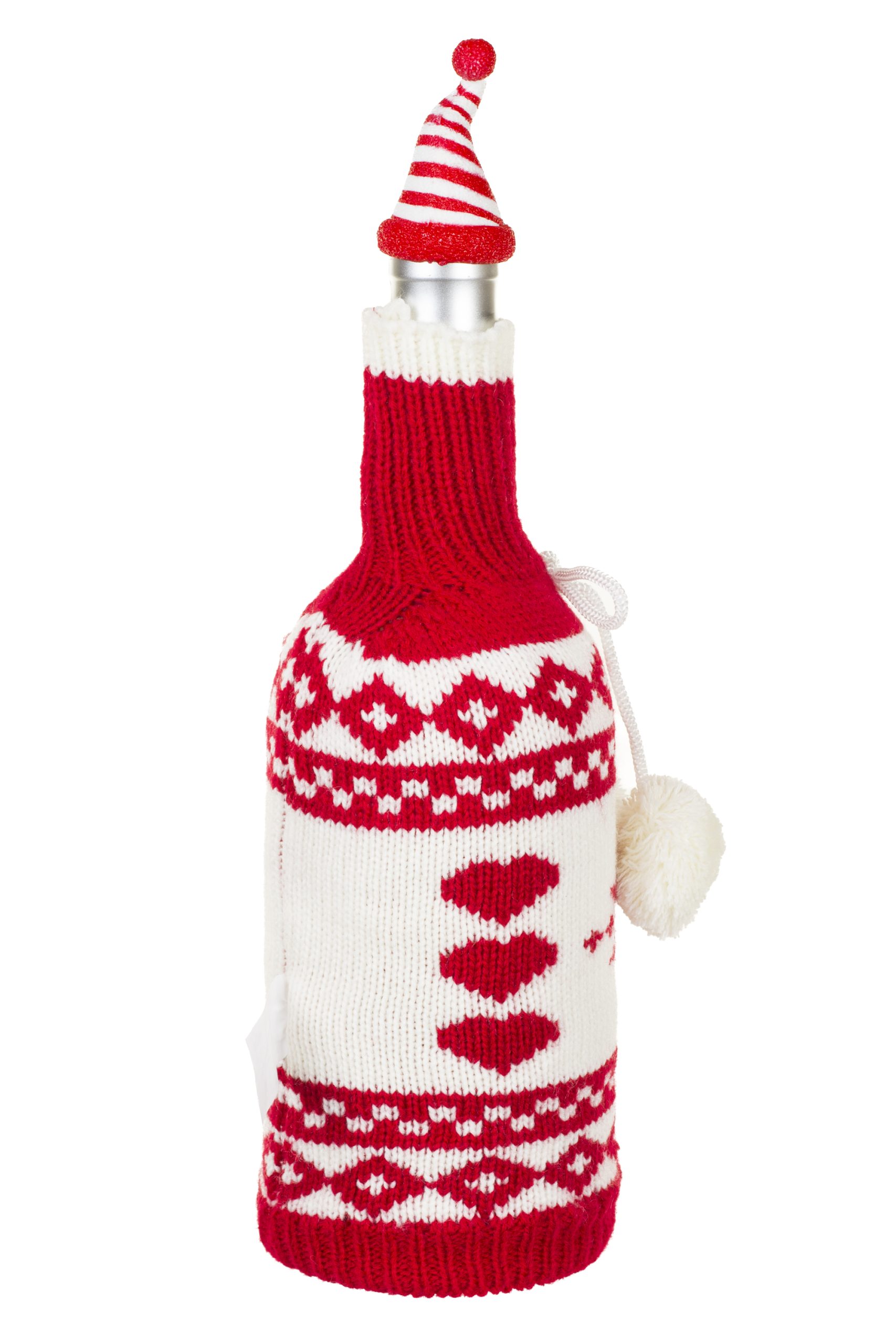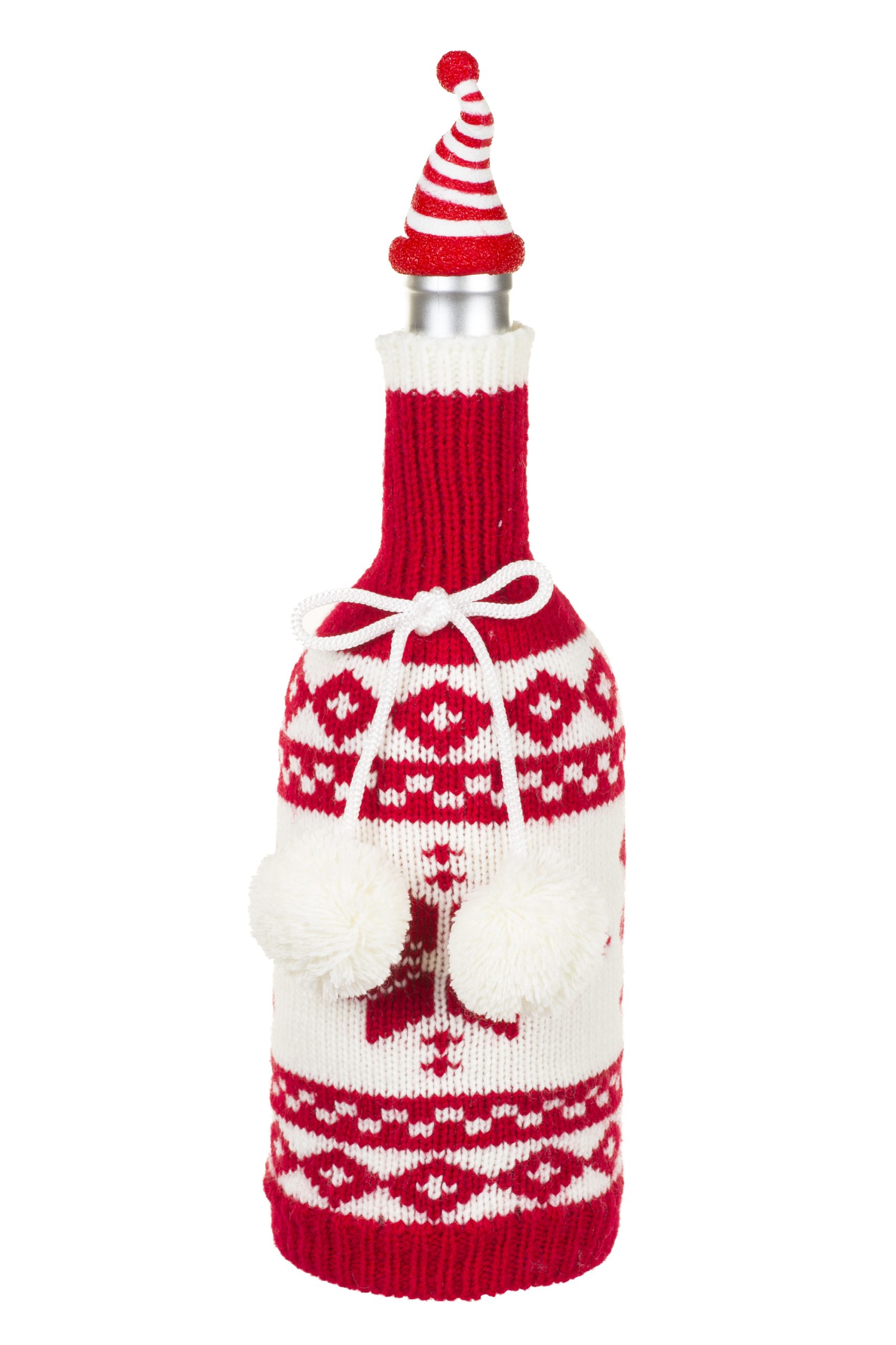 • Description: 11" Red and White Fabric Perennial Knitted Wine Bottle Cover with Pom Poms