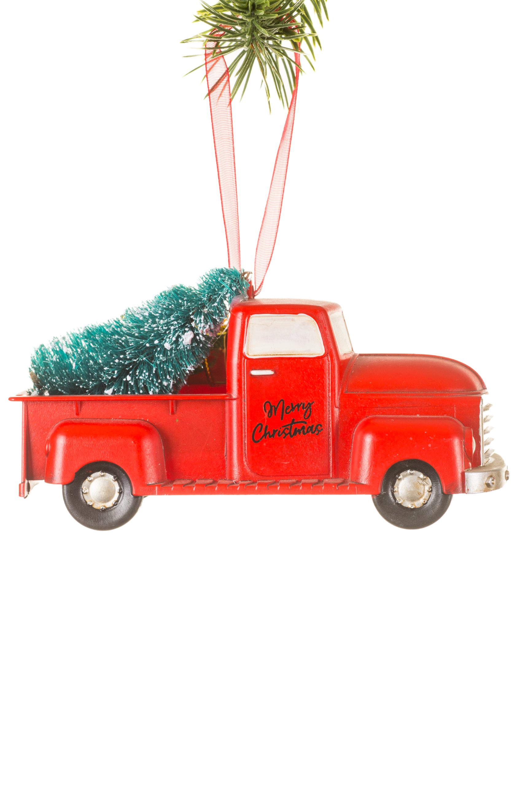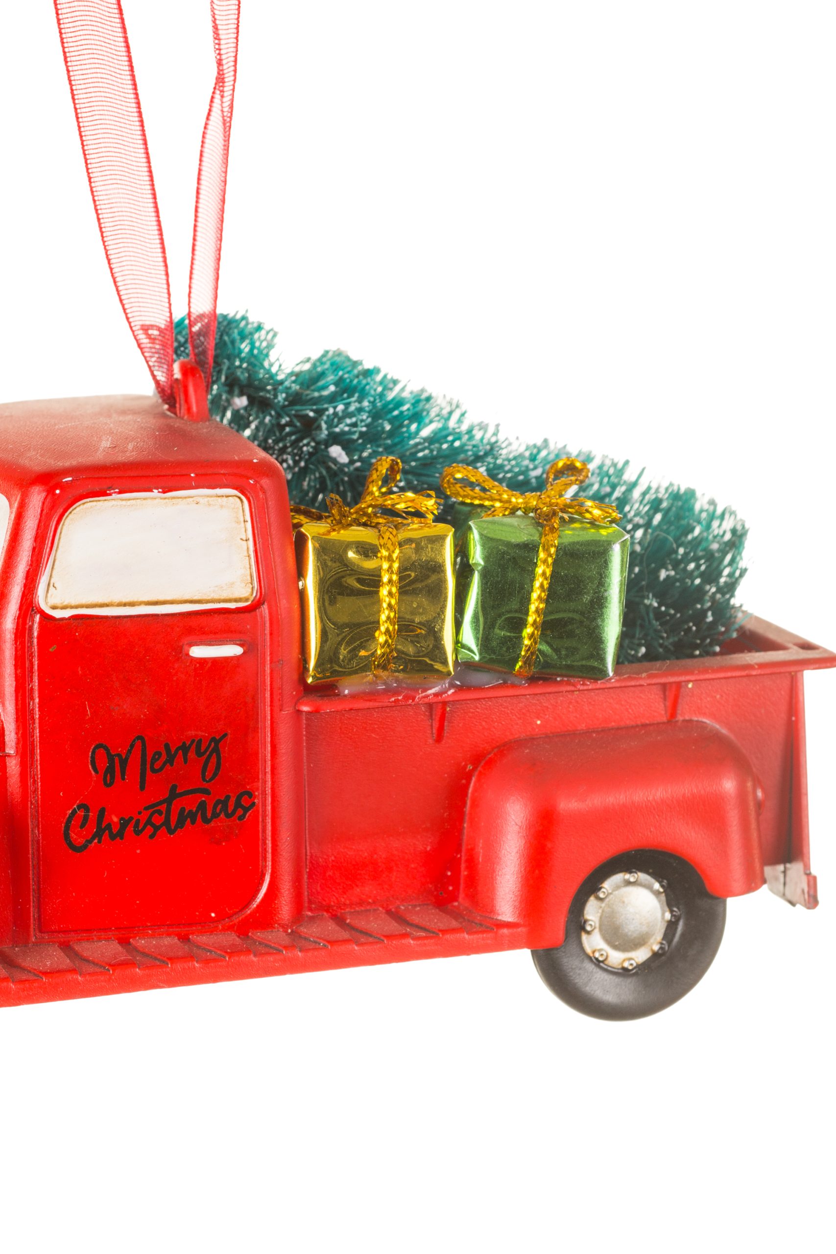 • Description: 5" Hanging Red Plastic Pickup Truck Ornament with Pine Tree, Presents & "Merry Christmas"