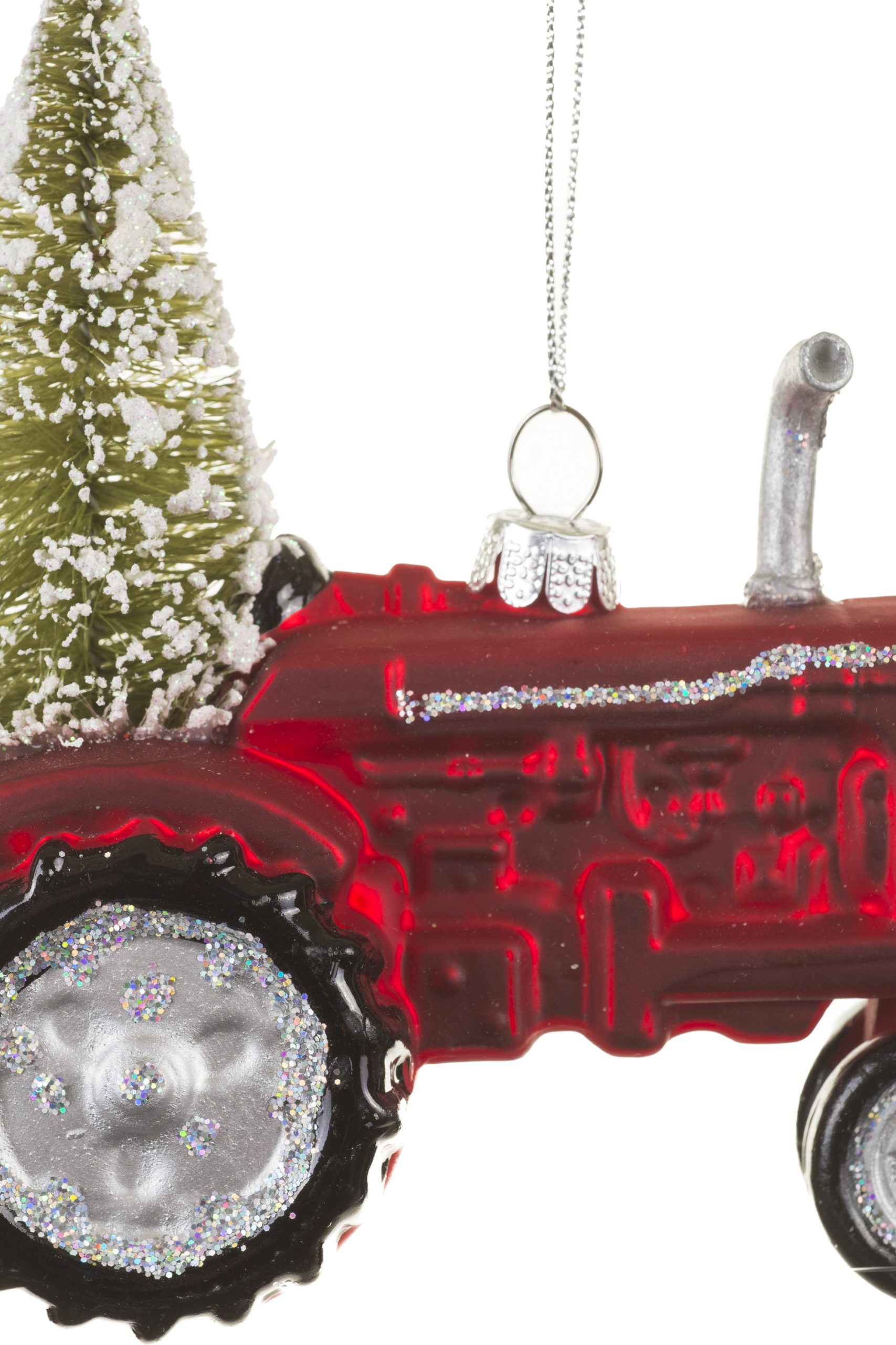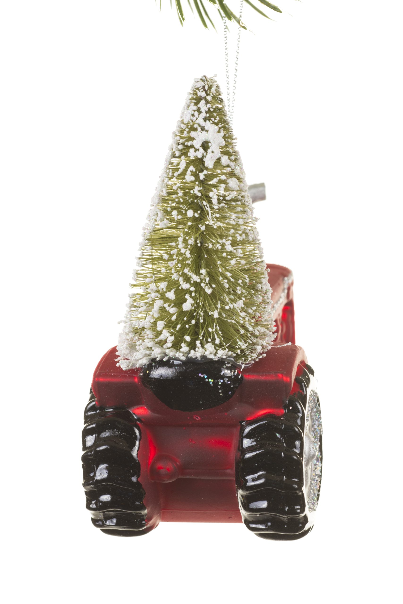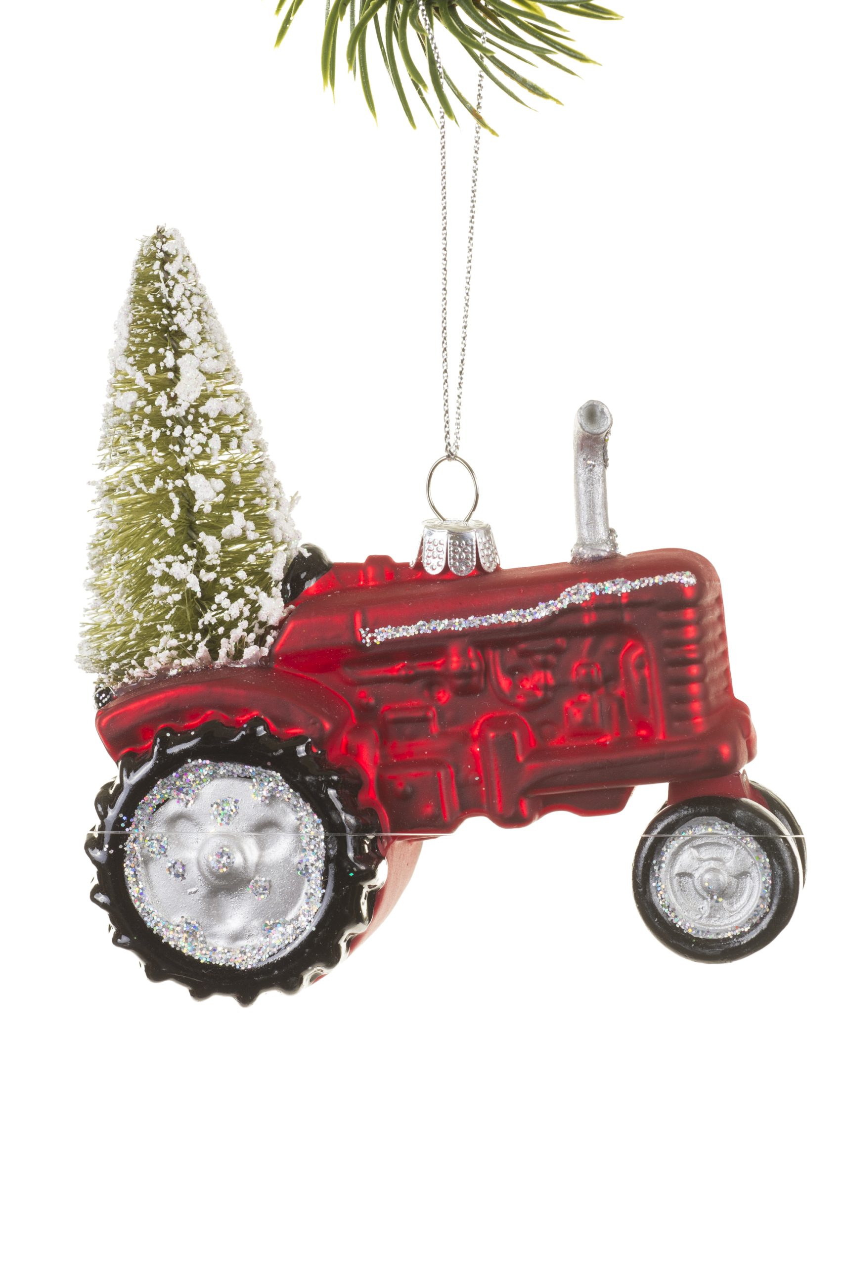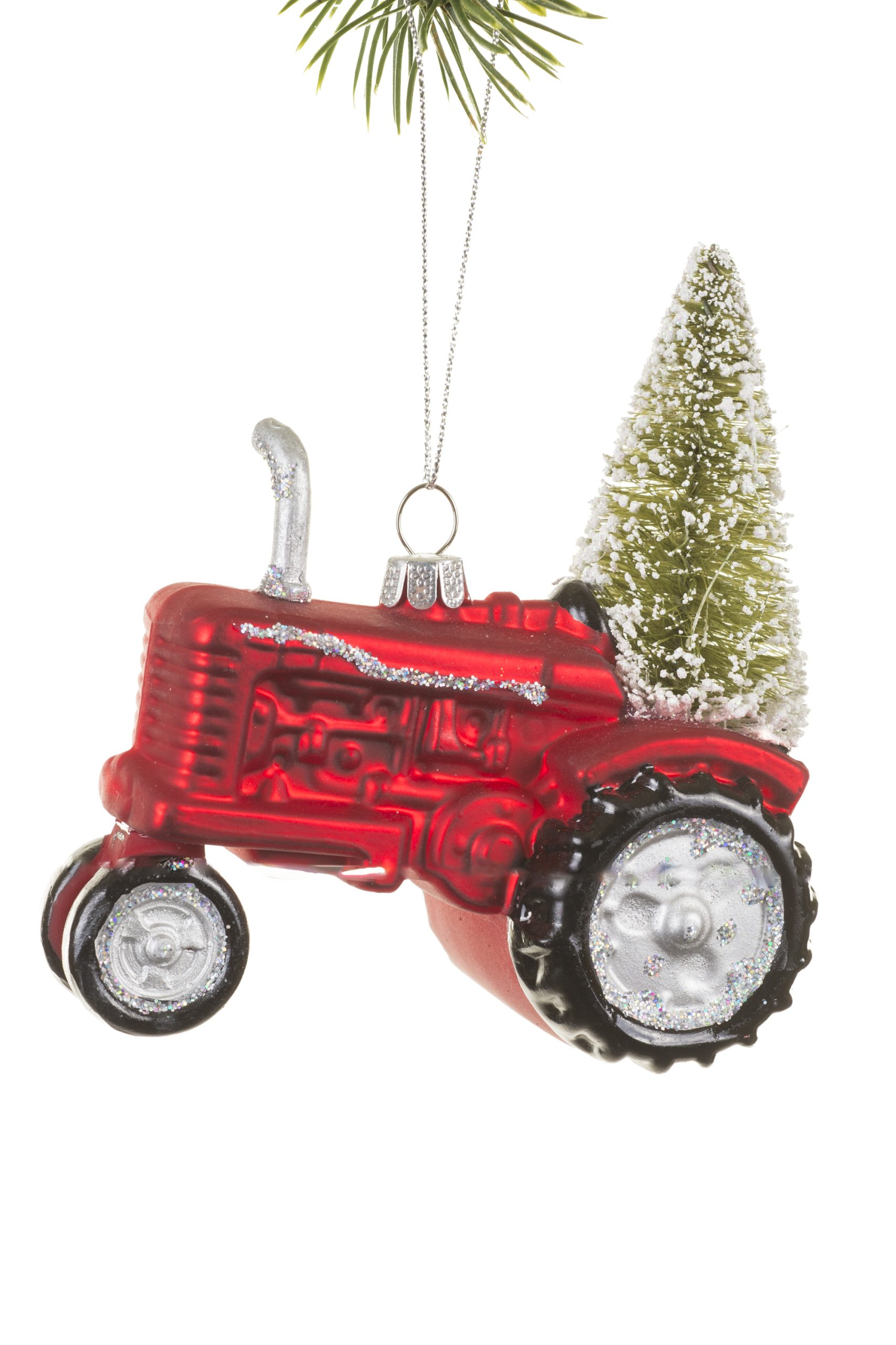 • Description: 4.5" Red and Green Glass Tractor Ornament with a Tree Attached