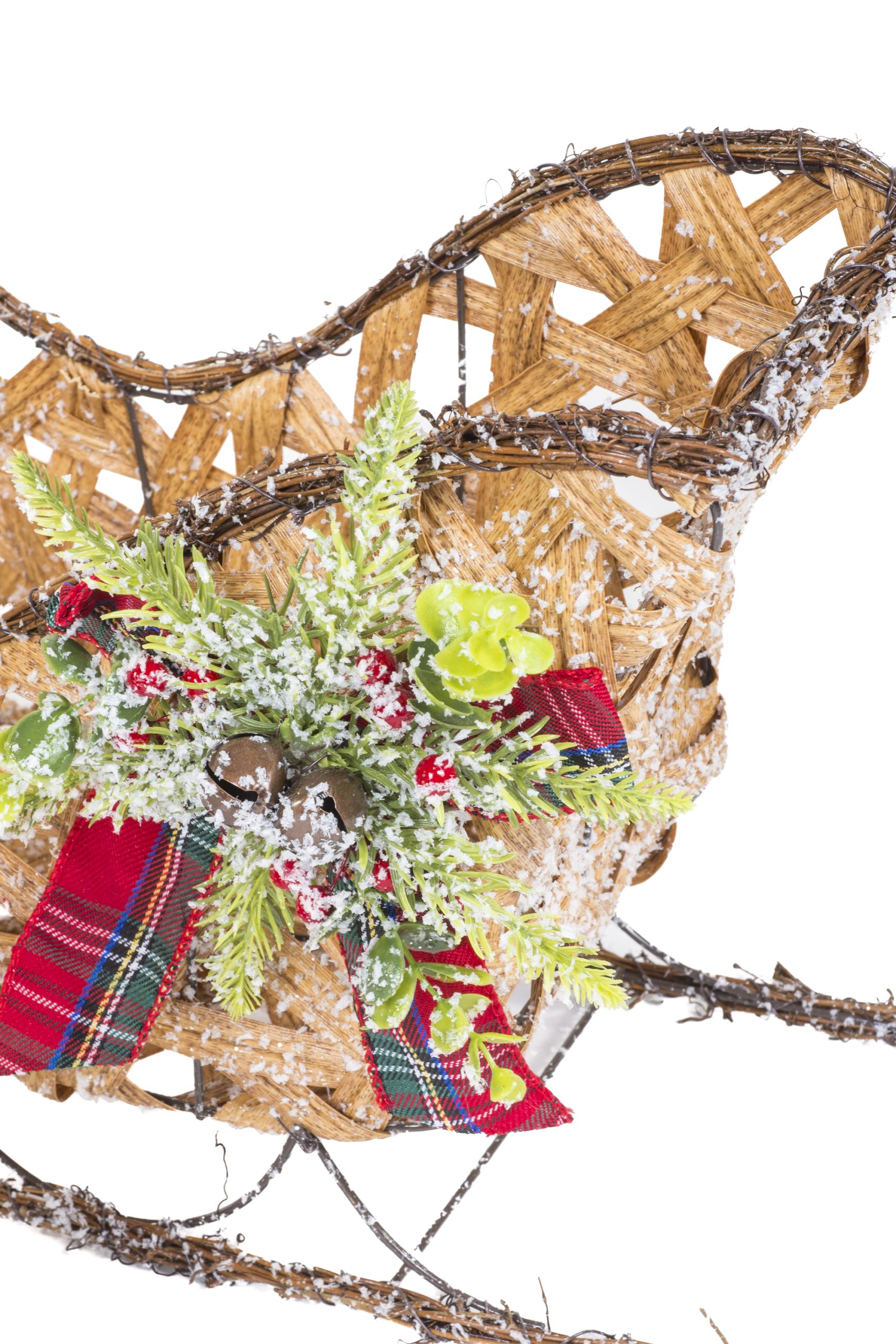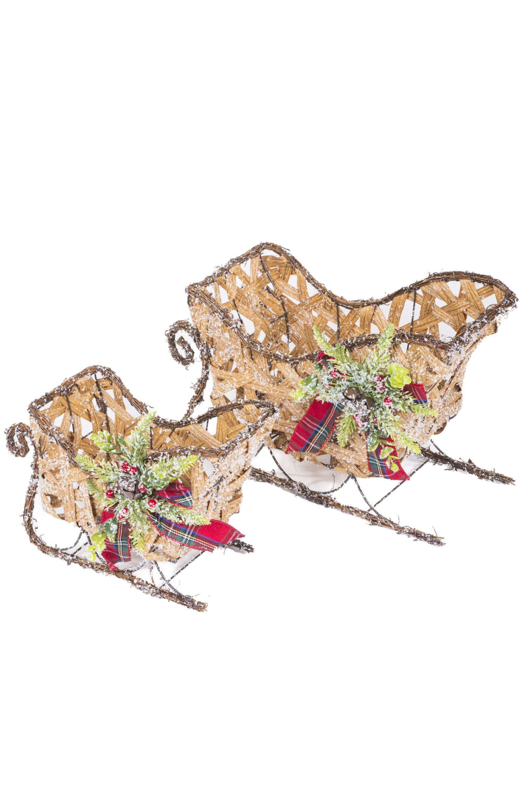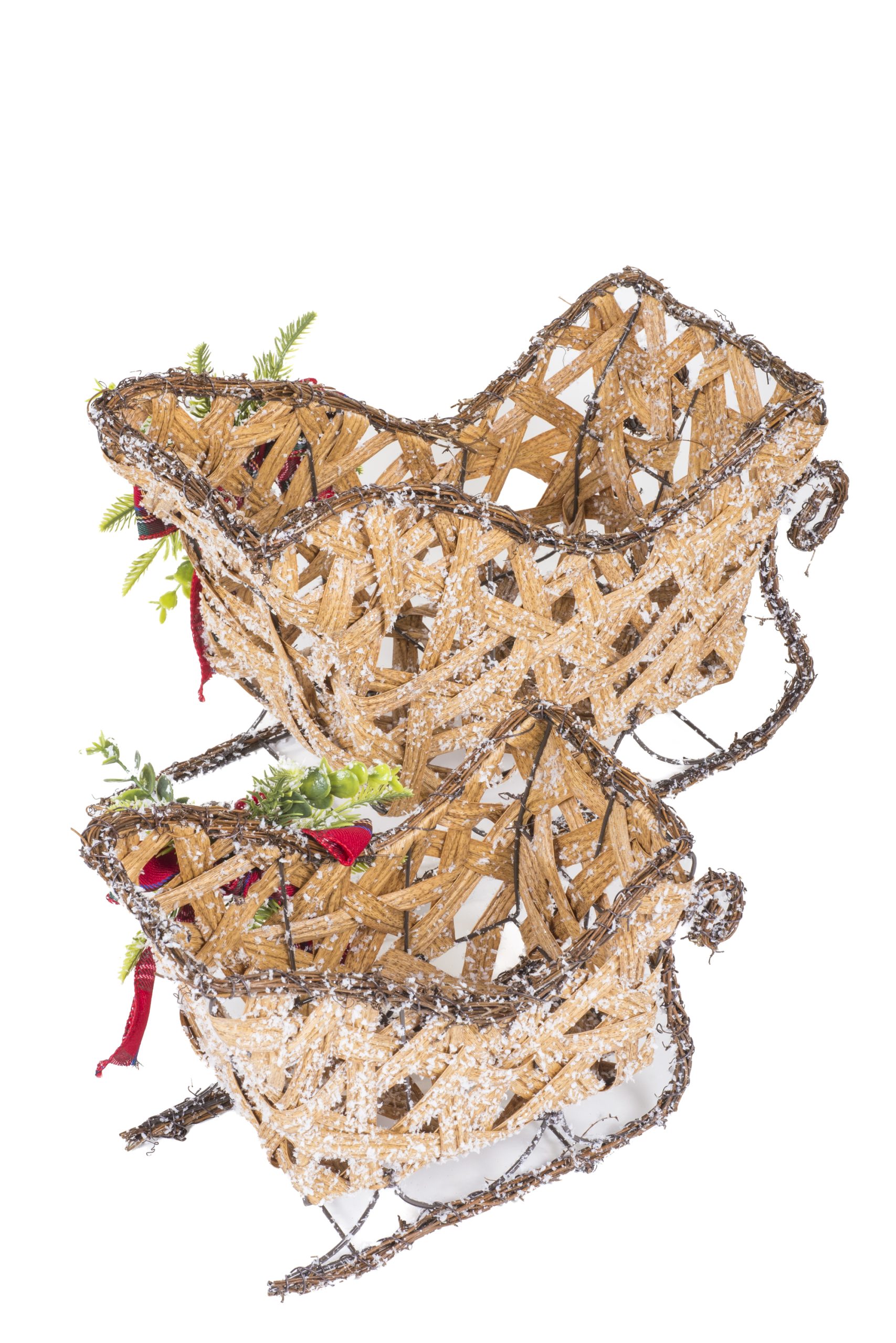 • Description: 17" Set Of 2 Frosted Light Brown Rattan Sleigh Accents with Spray & Bells