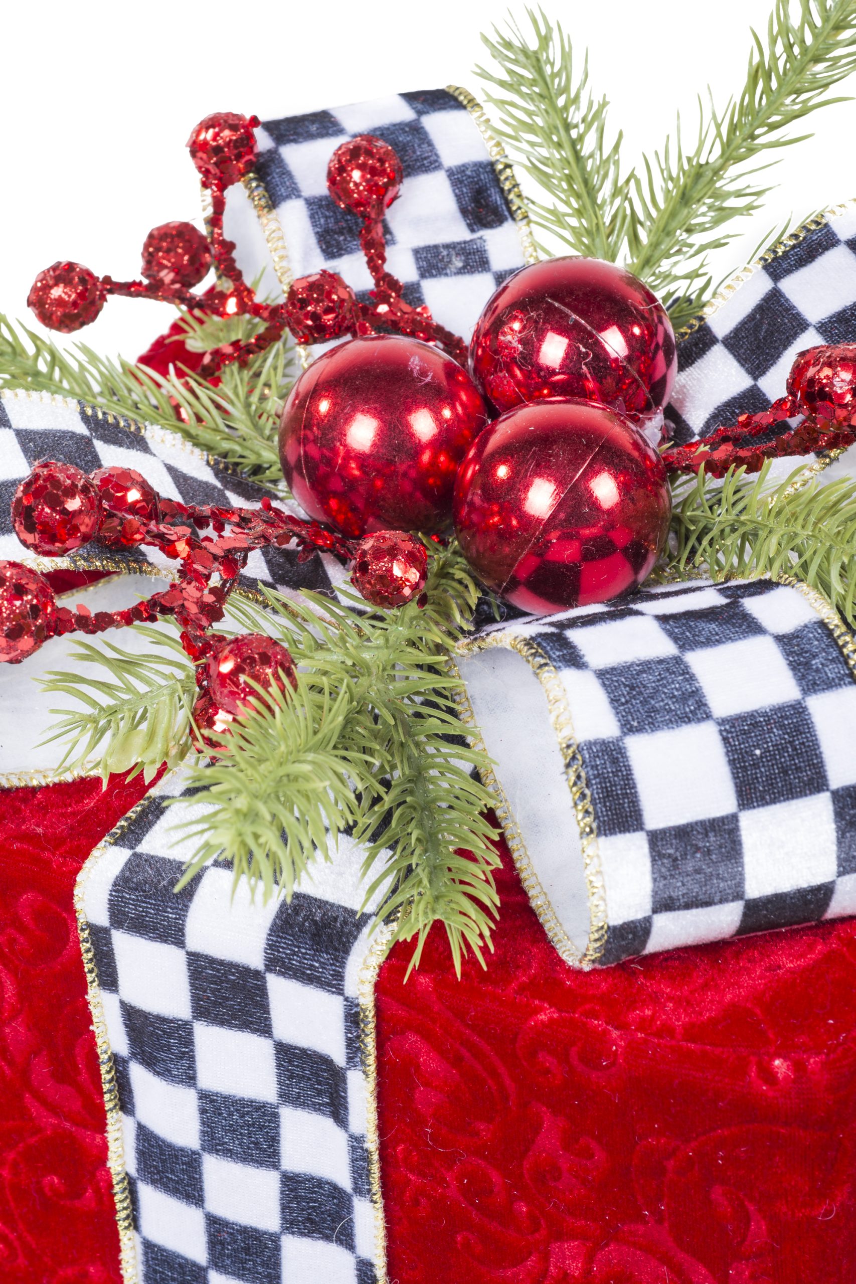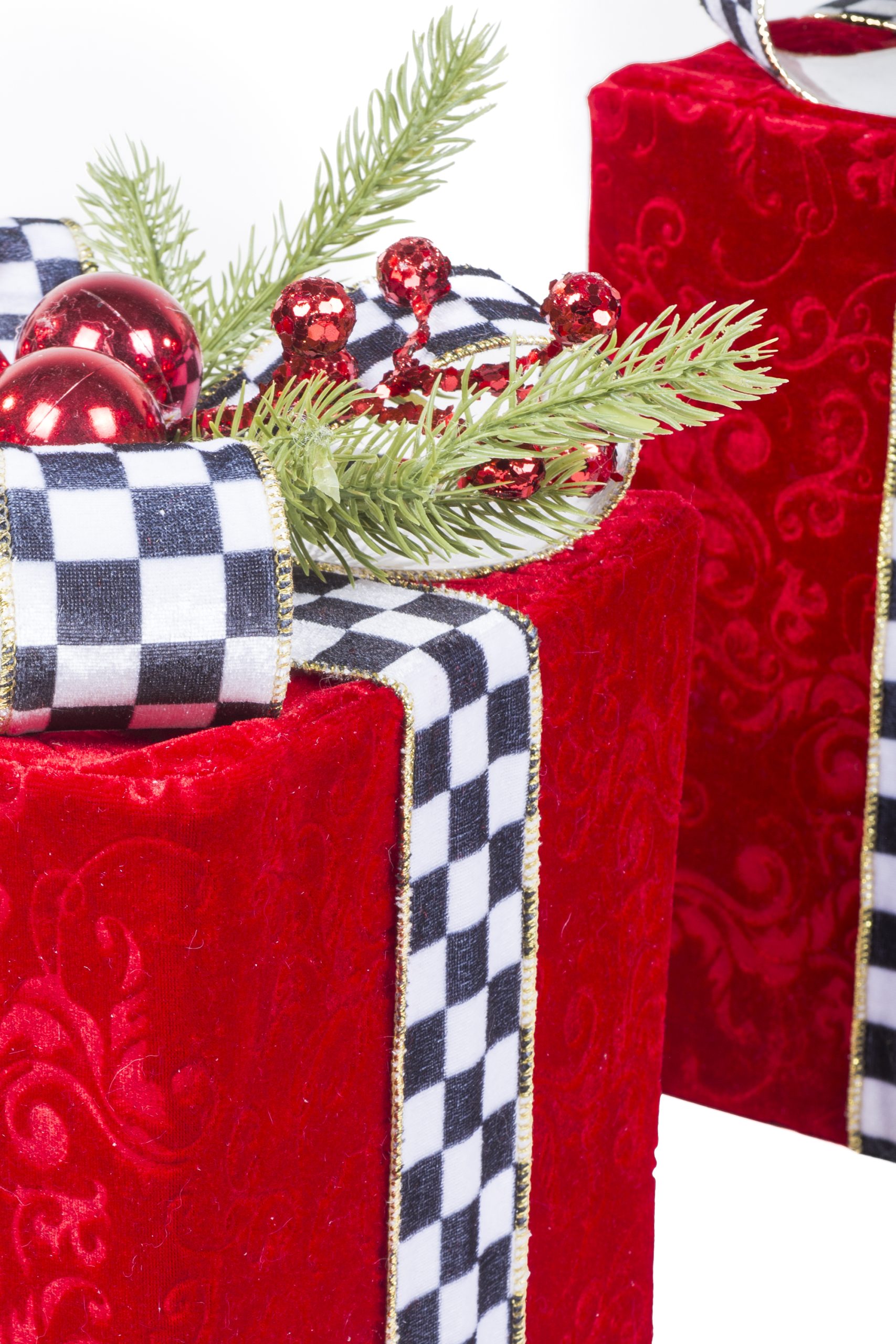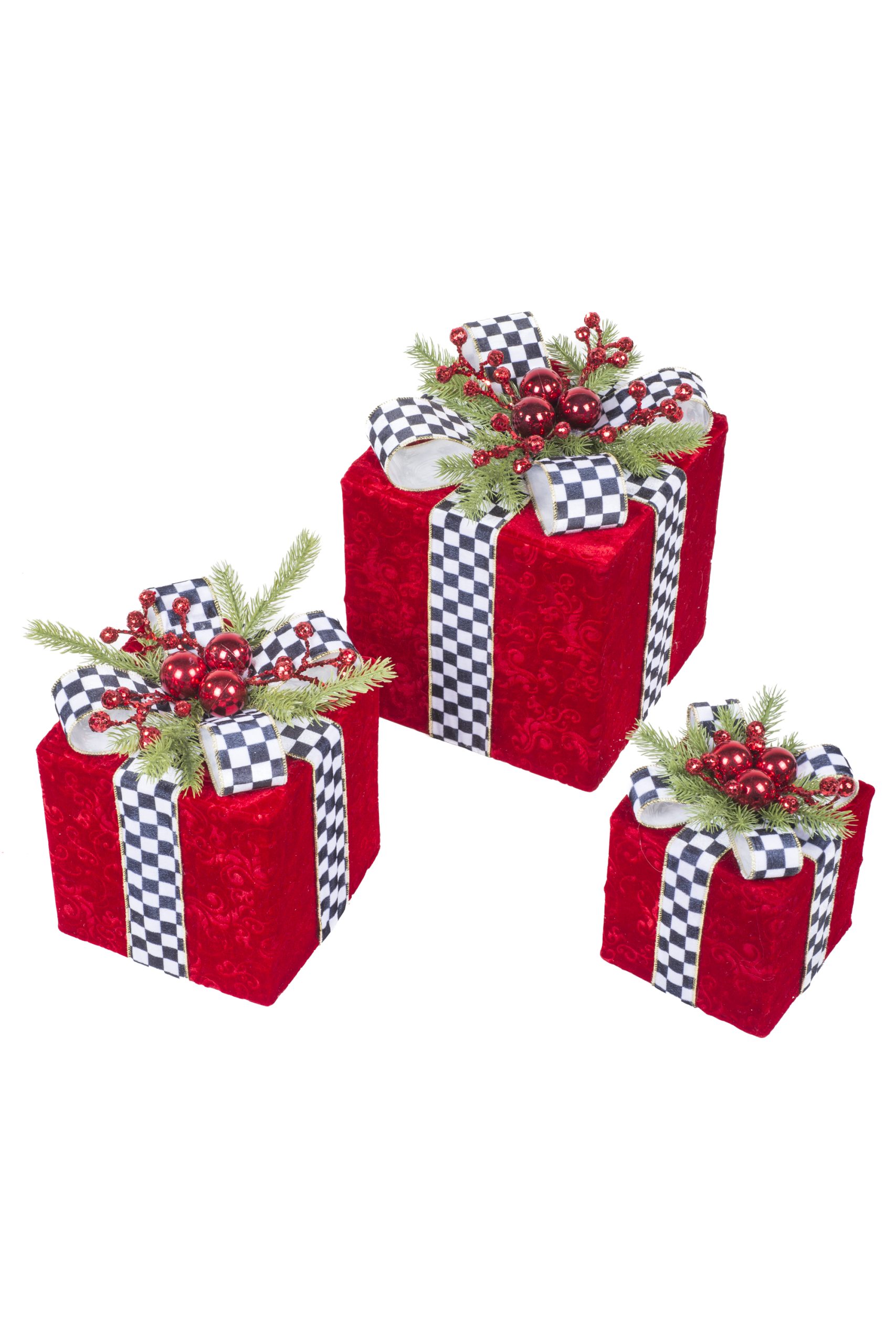 • Description: 10" Set Of 3 Velveteen Red Fabric Gift Box Accents with Checkered Ribbon & Holly Pine Bow
