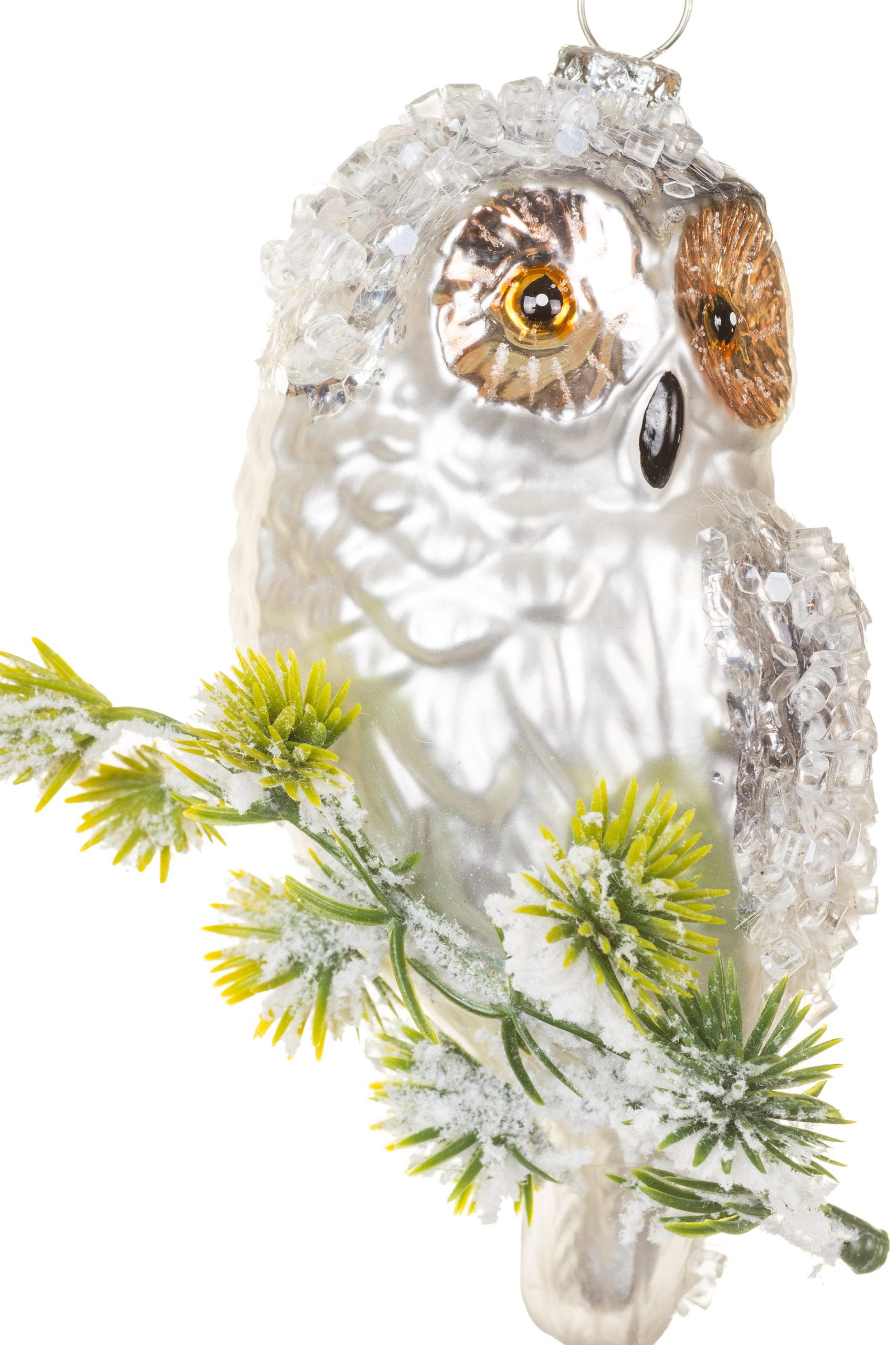 • Description: 6" Hanging Silver Glass Barn Owl Ornament with Icy Wings