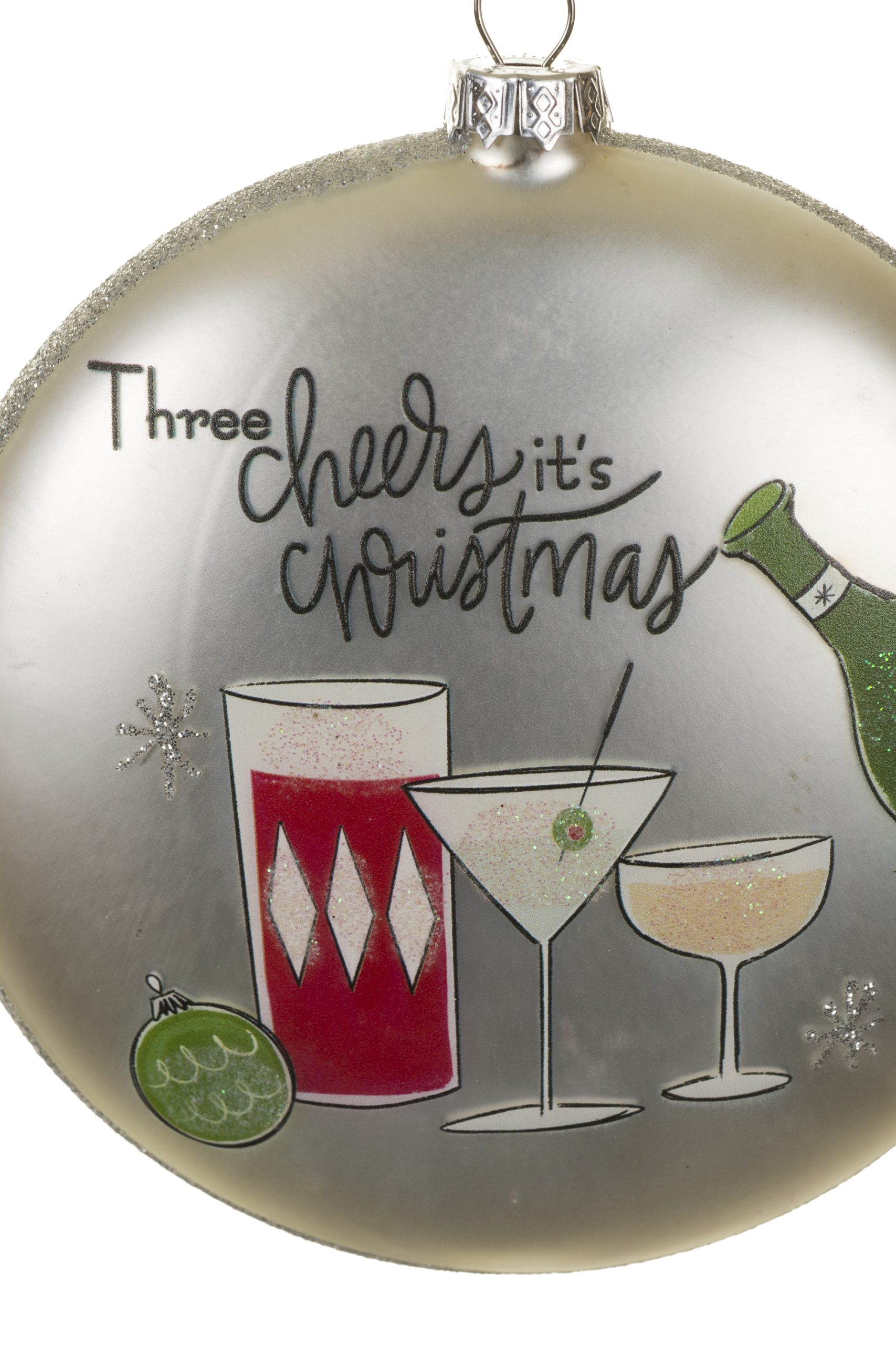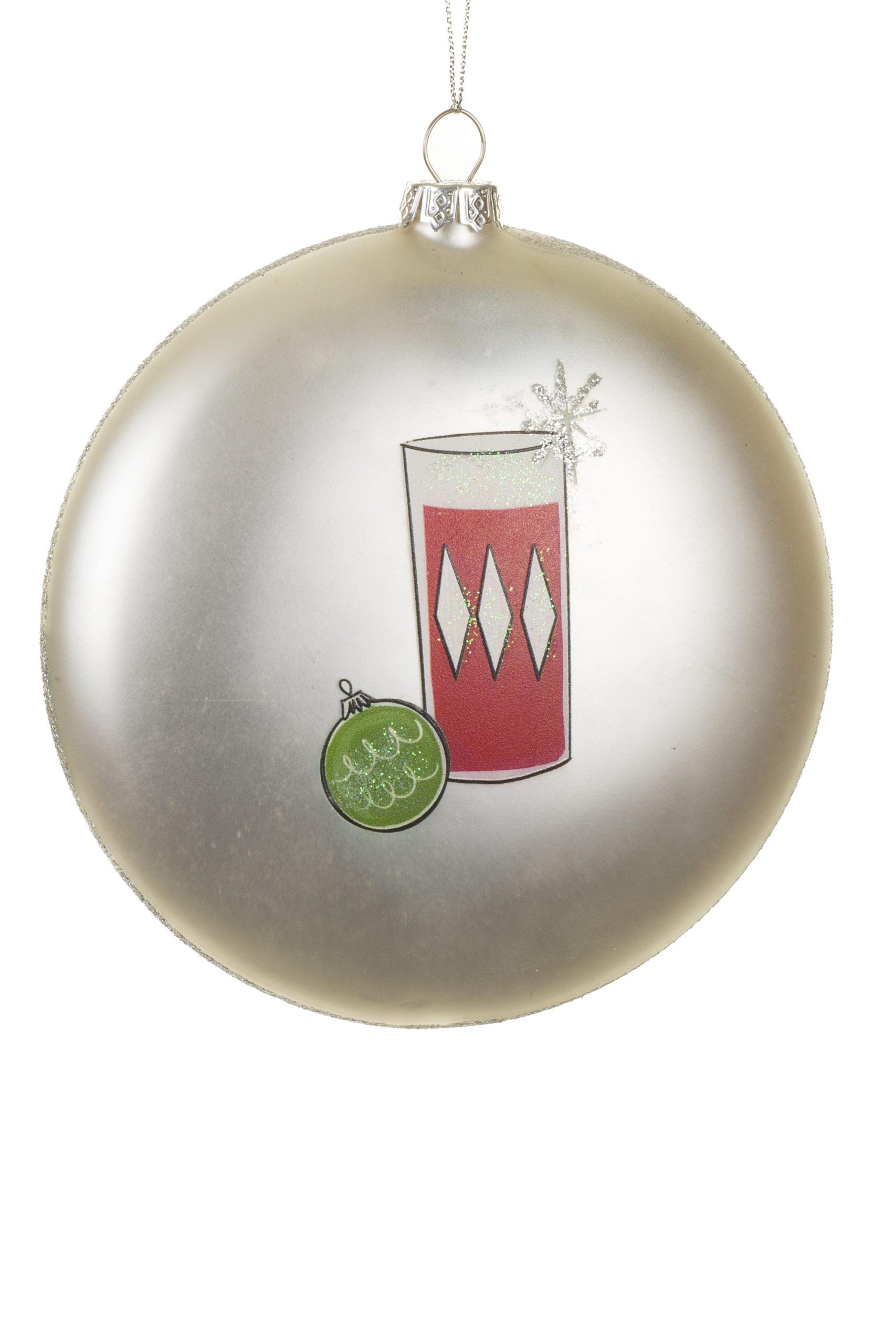 • Description: 5.5" Hanging Matte Silver Glass Medallion Ornament with Beverage Glasses