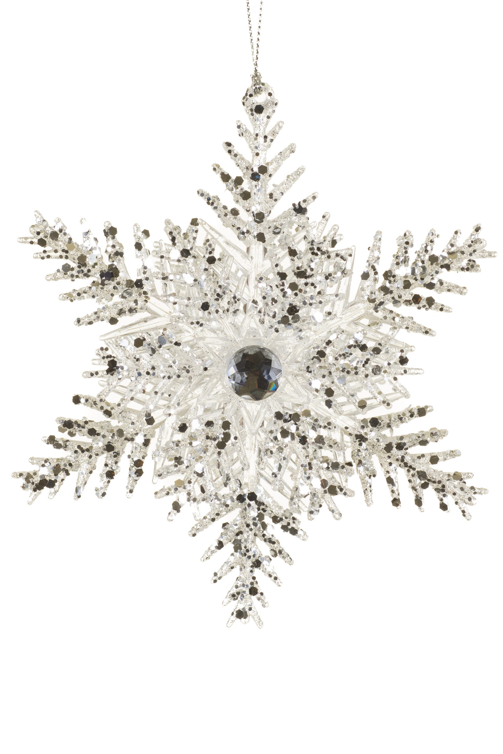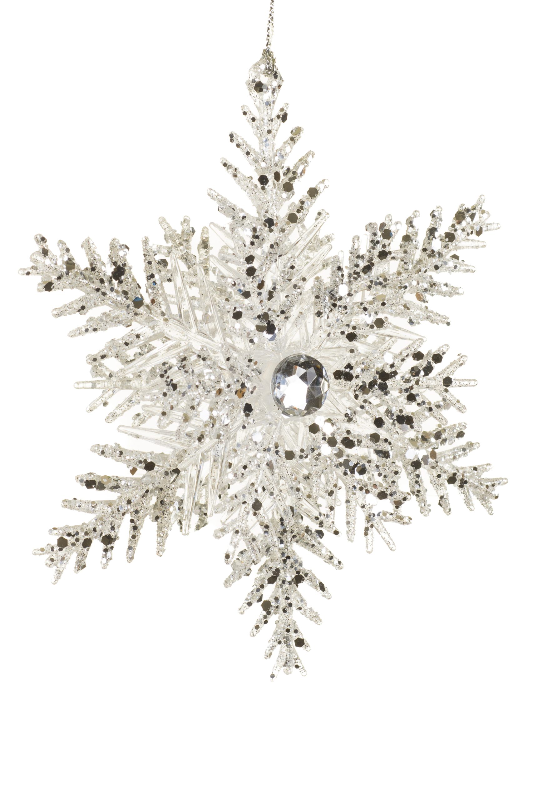 • Description: 5.5" Glittery Hanging Silver and Clear Plastic Snowflake Ornament with Jewelled Centers