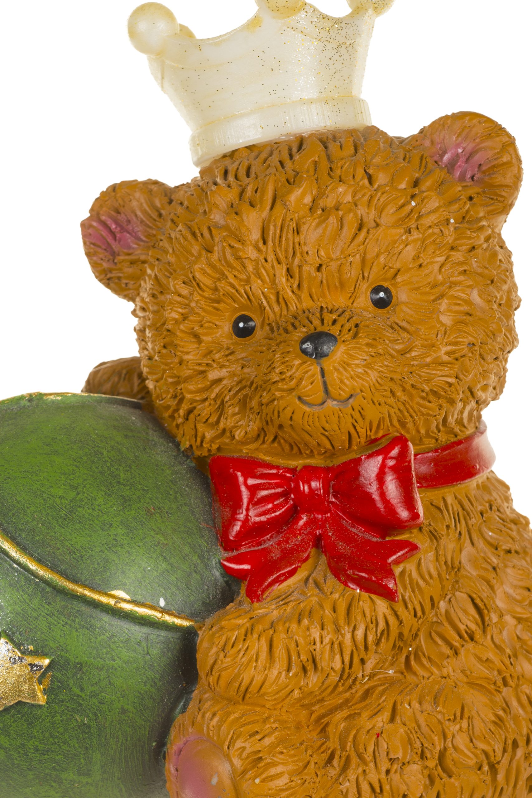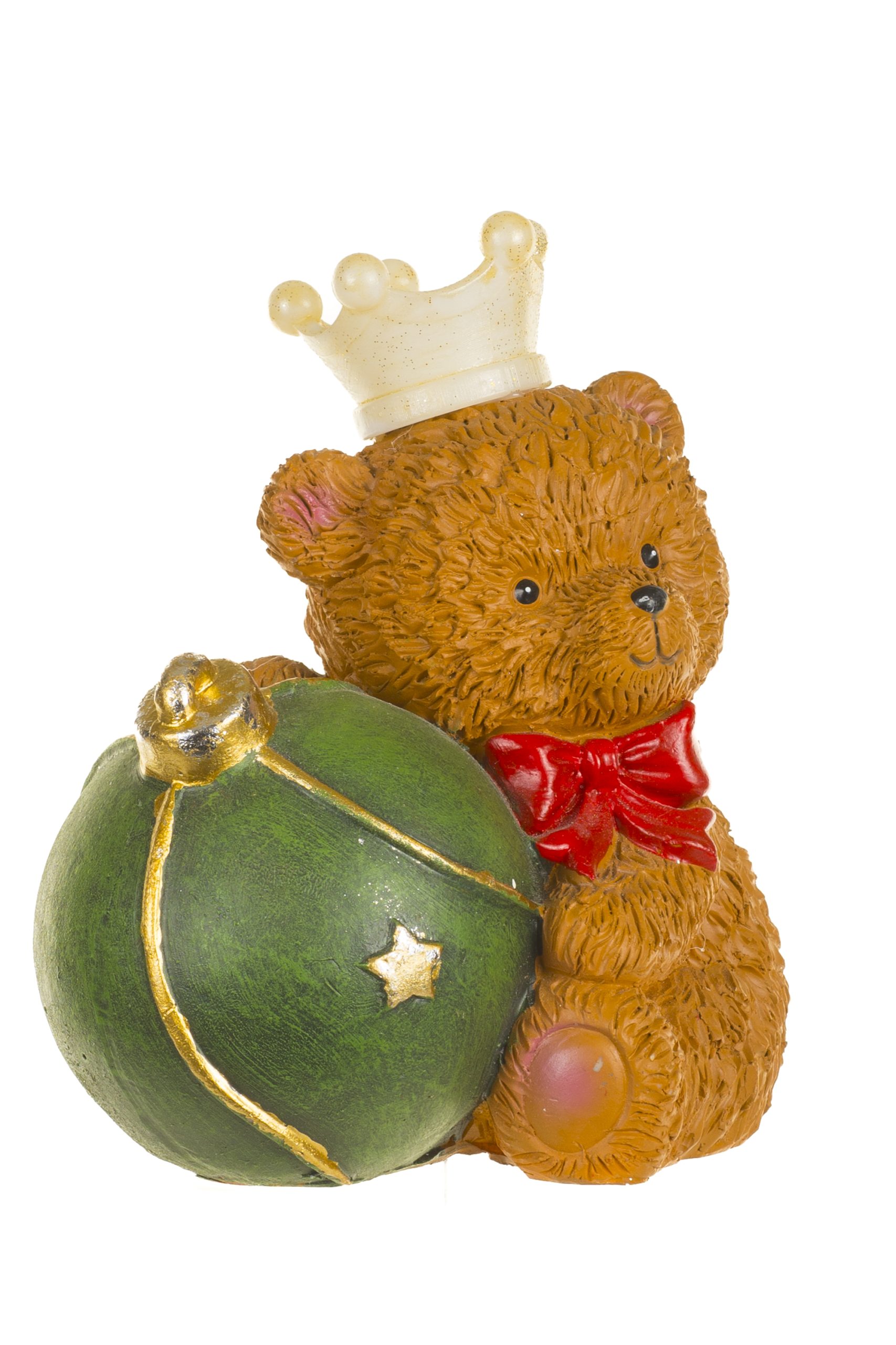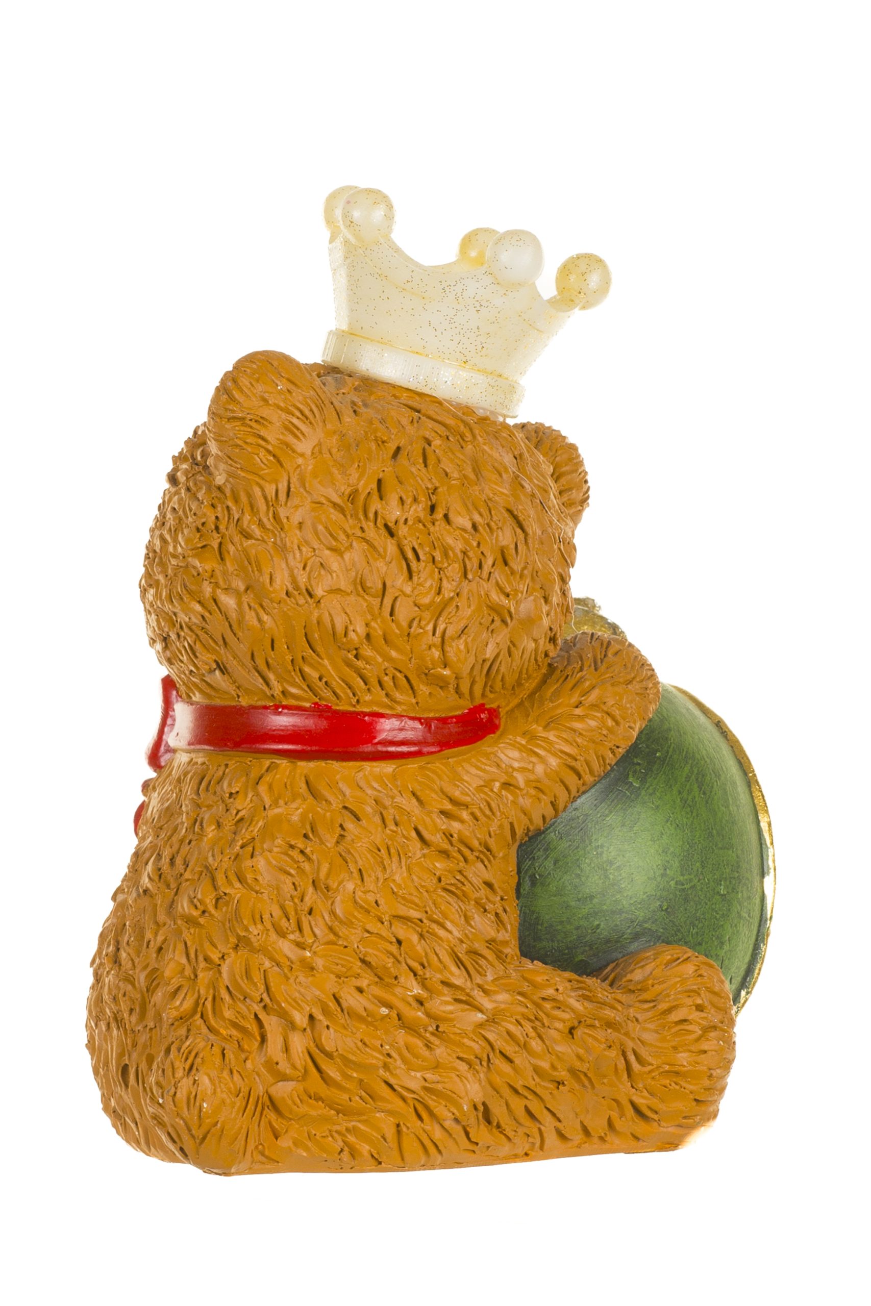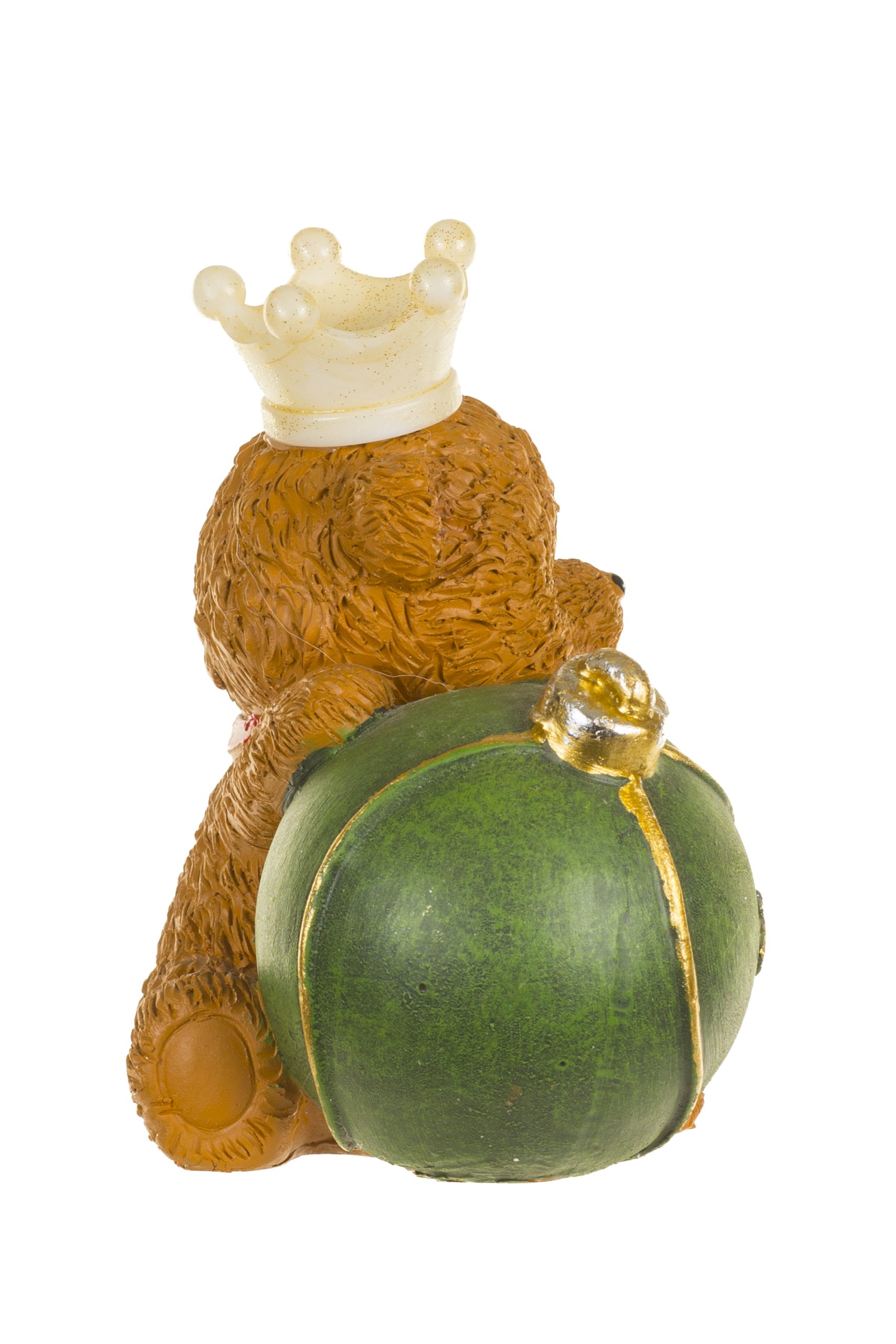 • Description: 6.3" Sitting Brown Resin King Teddy Bear Warm White LED Figurine Cradling Green Bauble & Wearing Crown