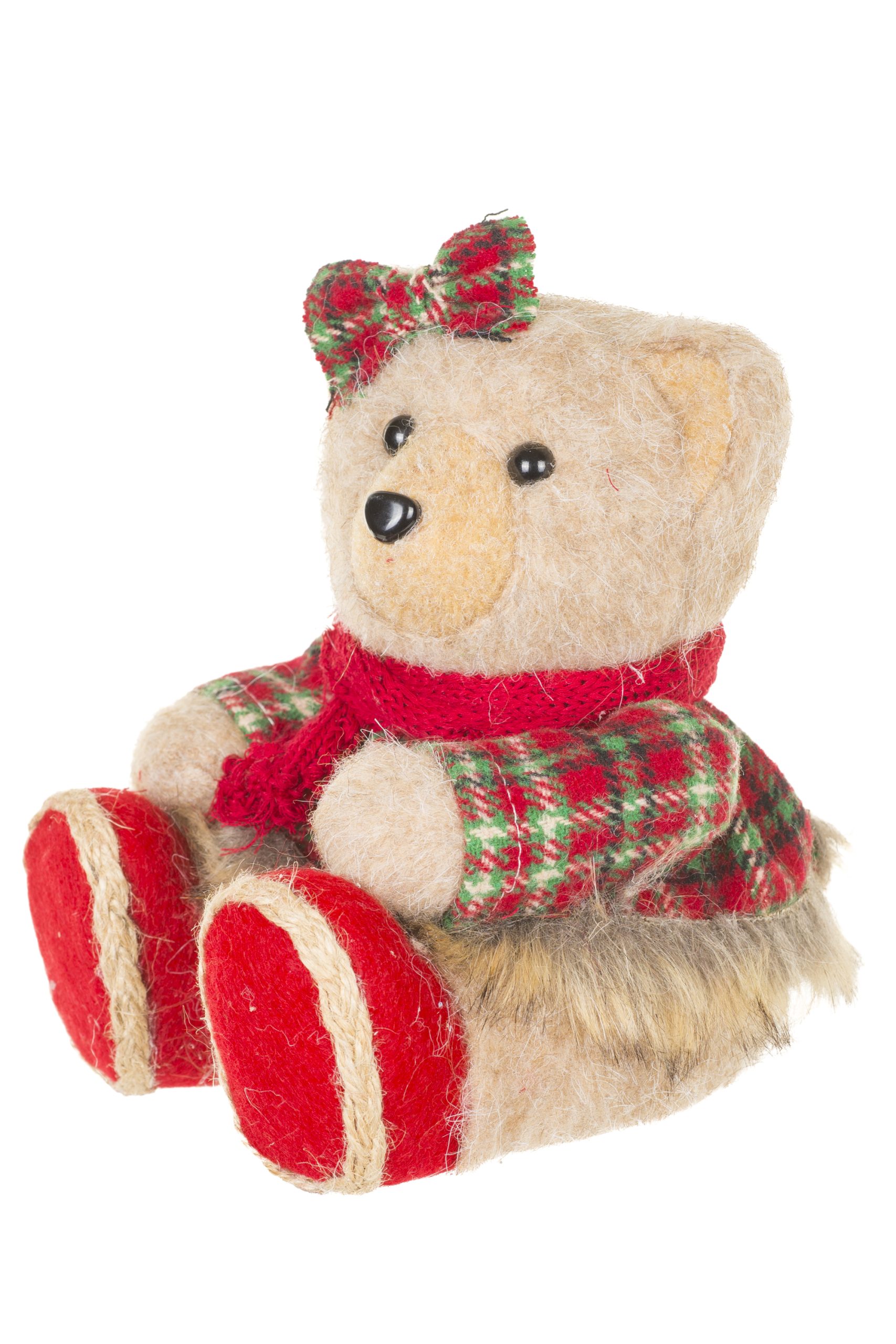 • Description: 6.3" Sitting Plaid Light Brown and Red Fabric Teddy Bear Girl Figurine with Bow & Sweater