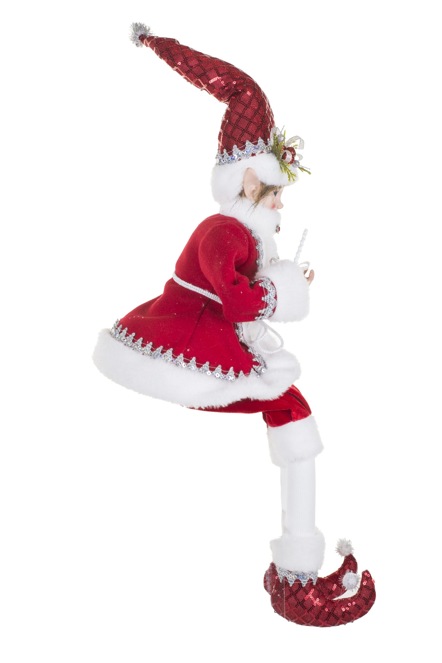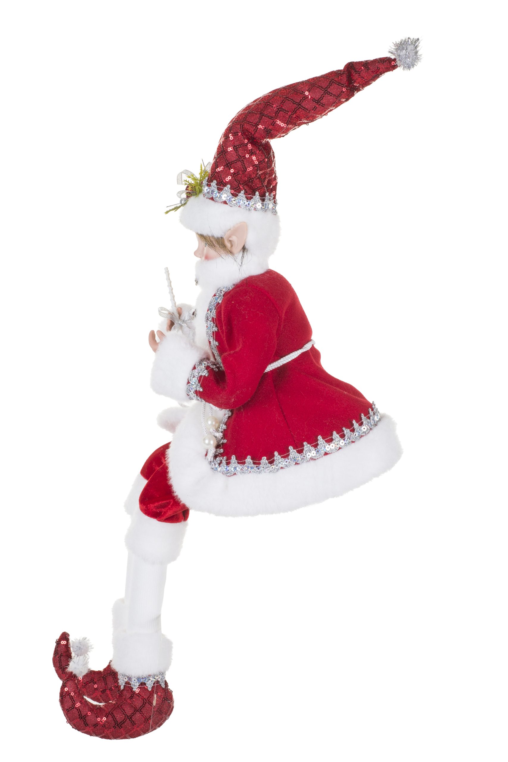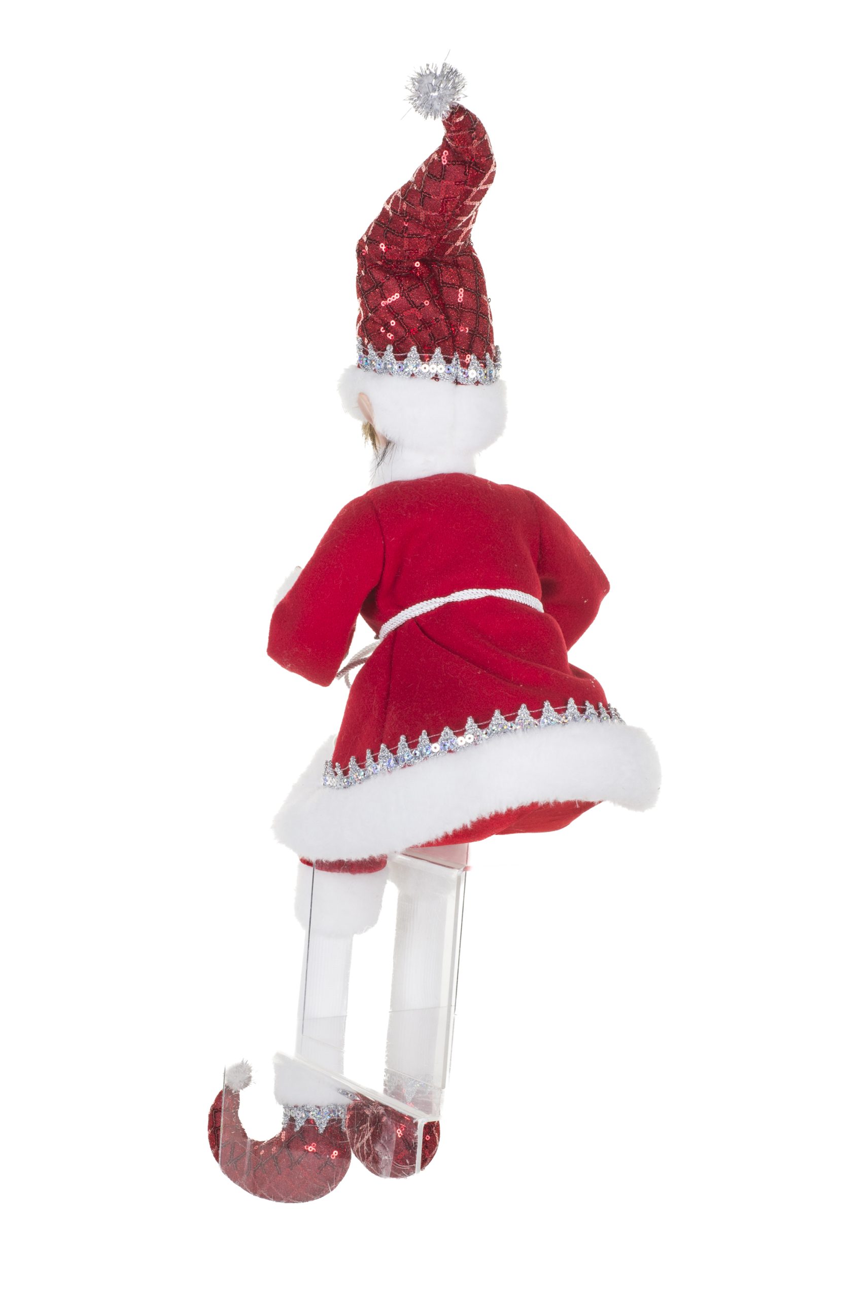• Description: 9" Sitting Sequin Red and Silver Velvet Elf Figurine with Sparkly Silver Sequins & Wearing Red Santa Outfit
