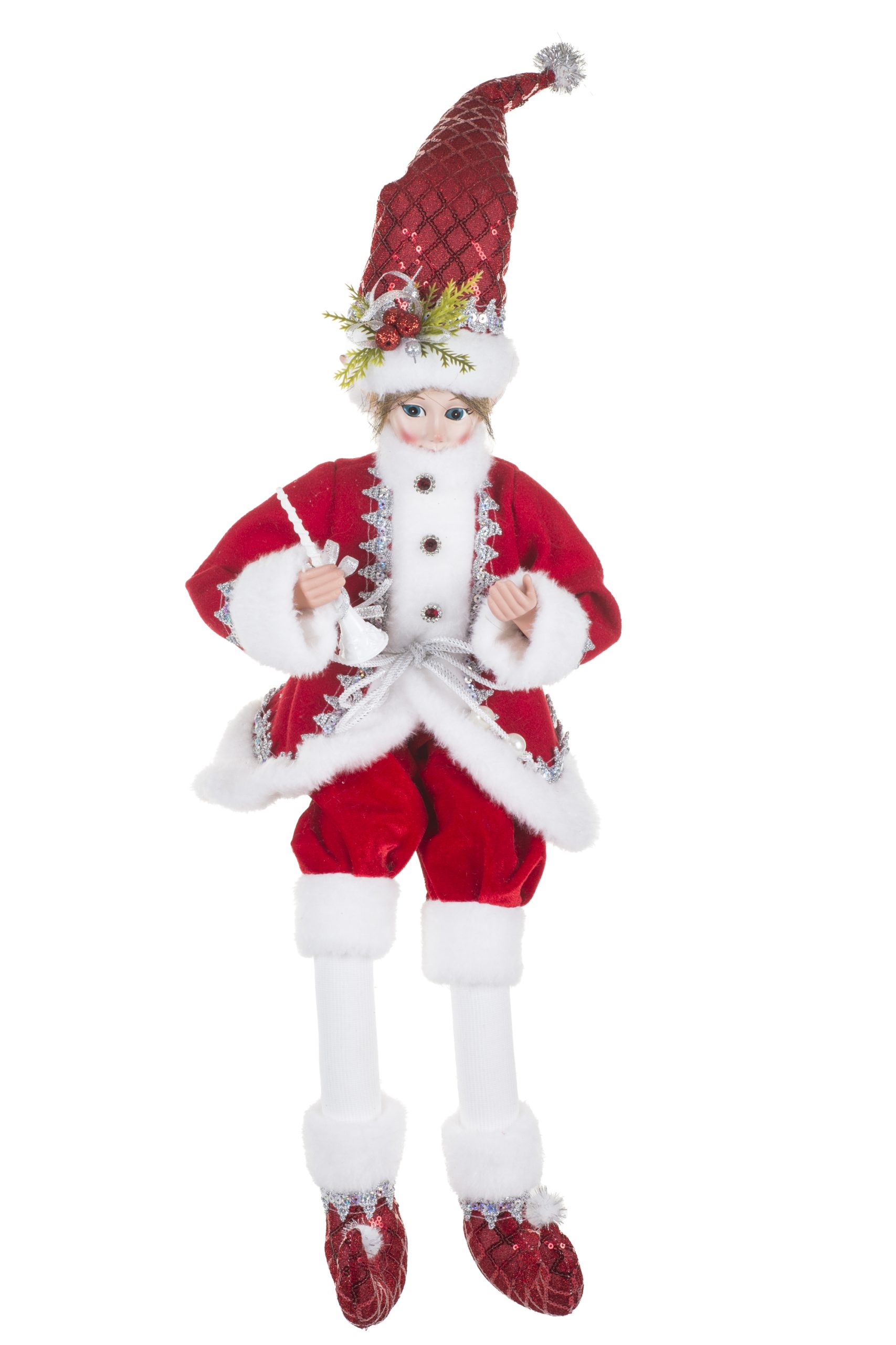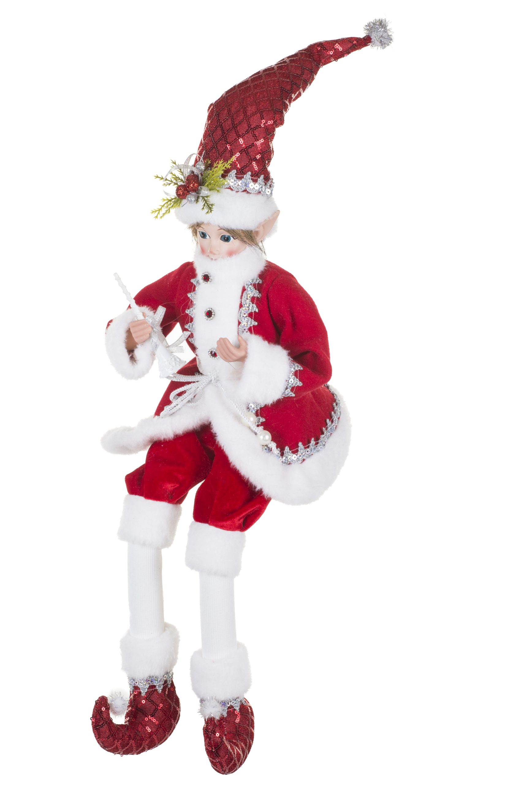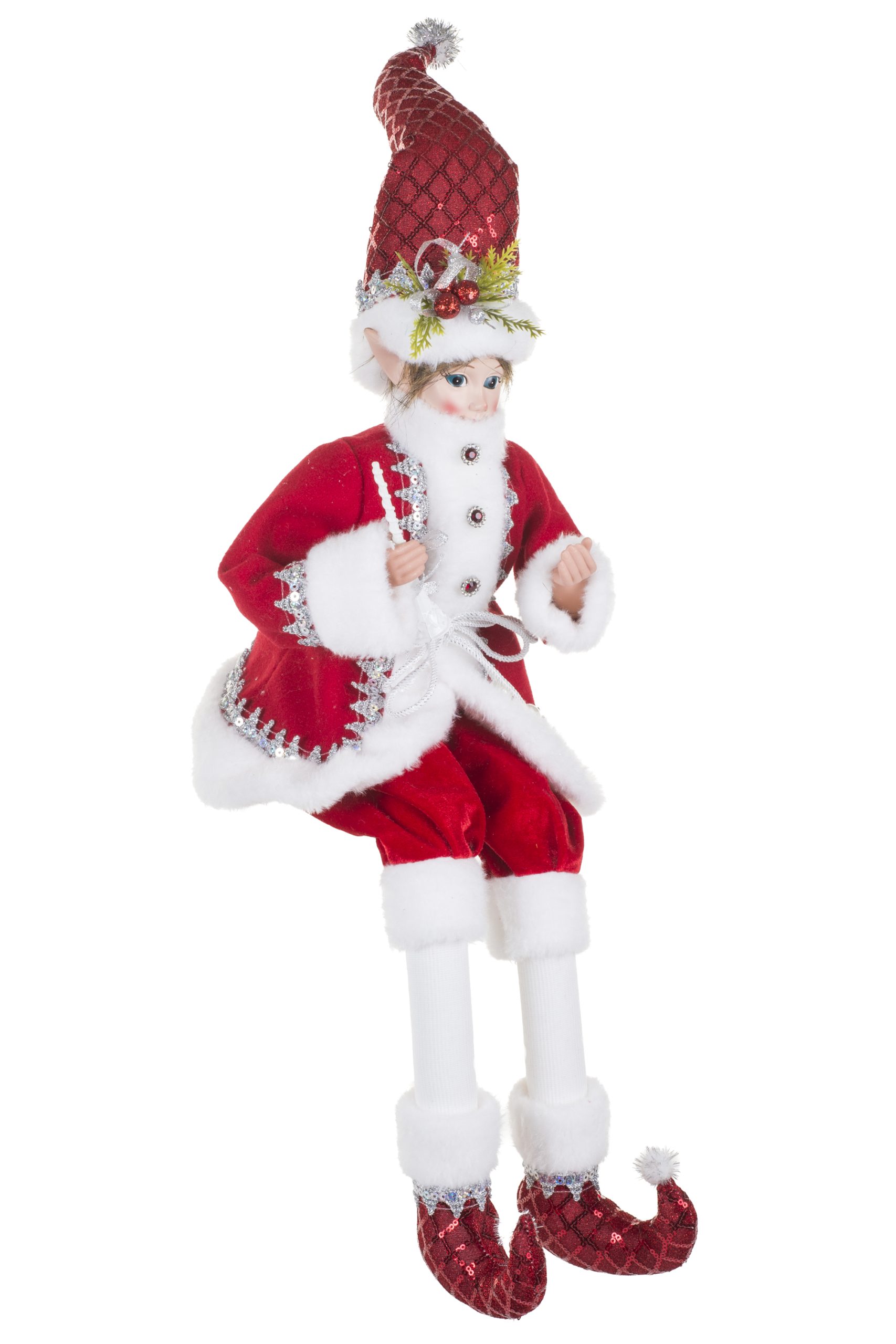• Description: 9" Sitting Sequin Red and Silver Velvet Elf Figurine with Sparkly Silver Sequins & Wearing Red Santa Outfit