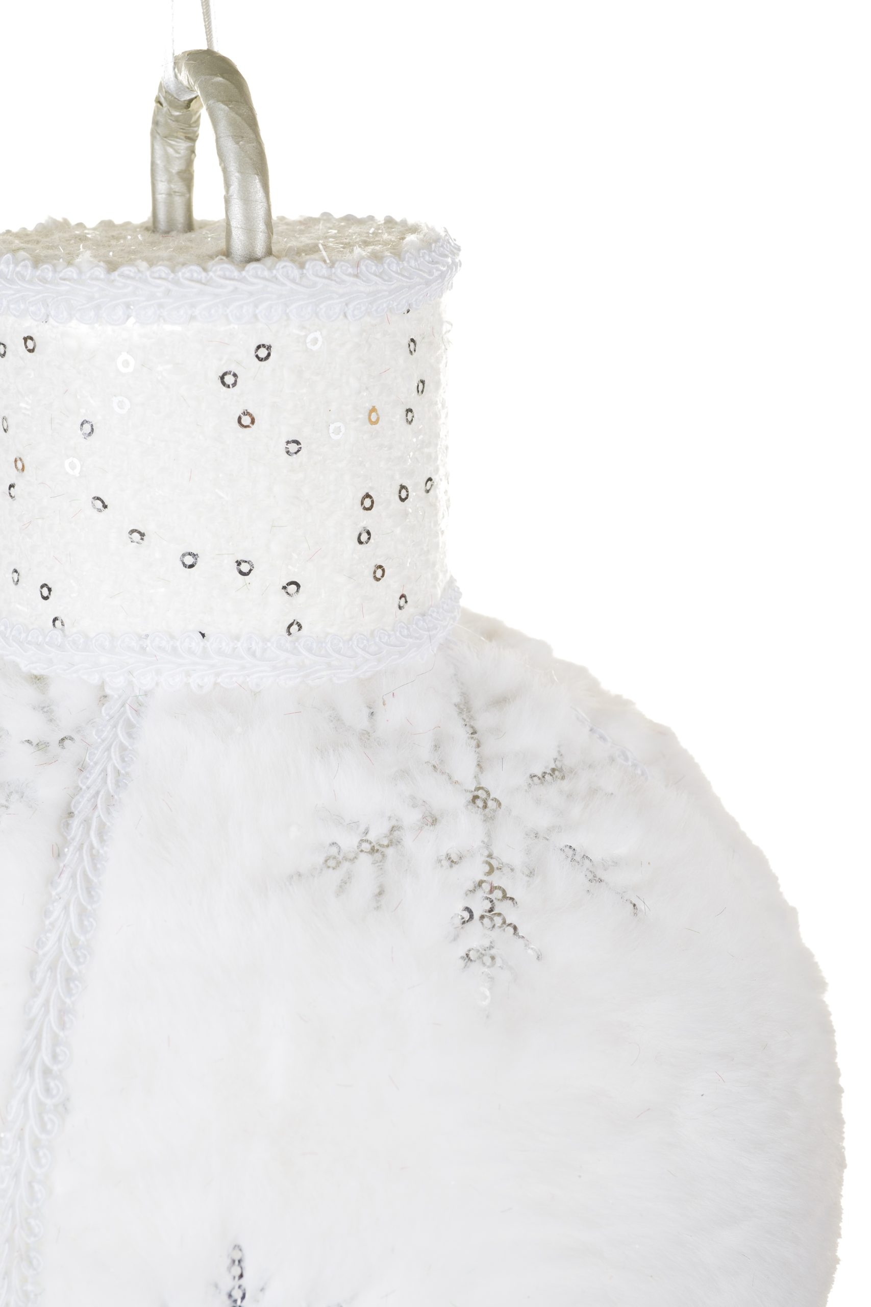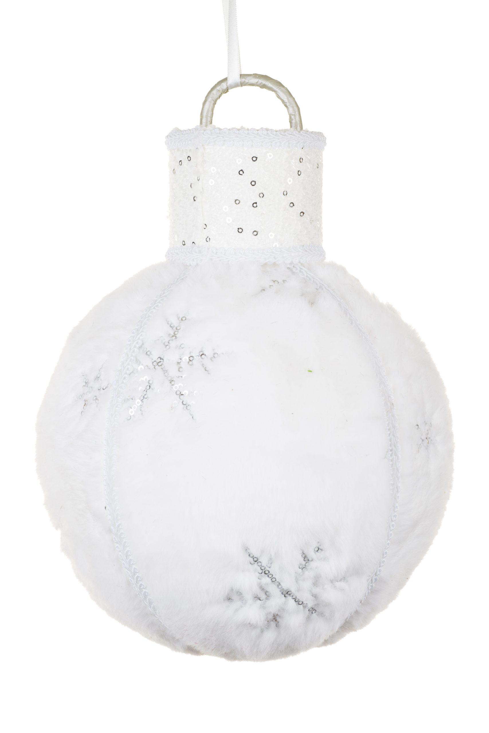 • Description: 11.5" Small Fluffy Hangable White Fabric Oversized White Bauble with Snowflake Design