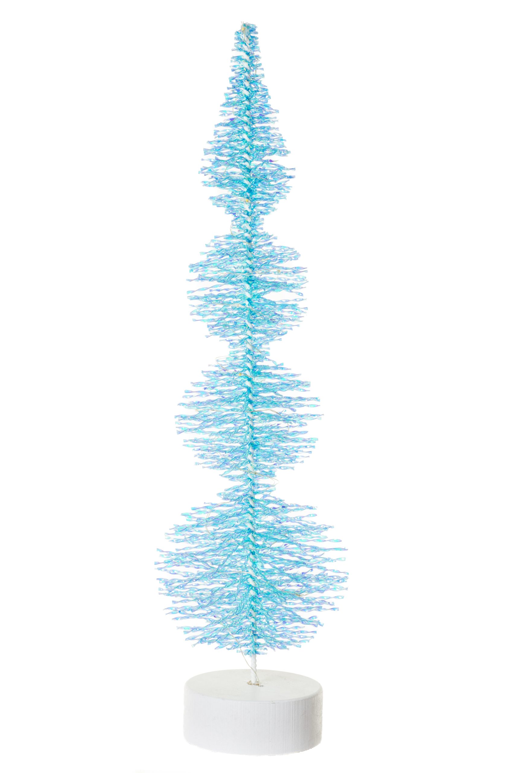 • Description: 16" Small Table-Top Sky Blue and Iridescent Nylon Twined Bristle Tree LED Accent with White Base