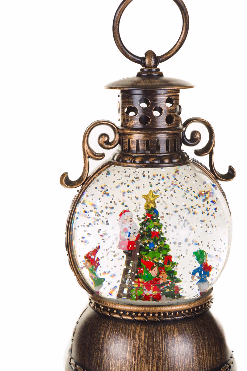 • Description: 8" Musical Bronze Plastic Lantern Warm White LED Snow Globe with Santa's Tree and Swirling Glitter