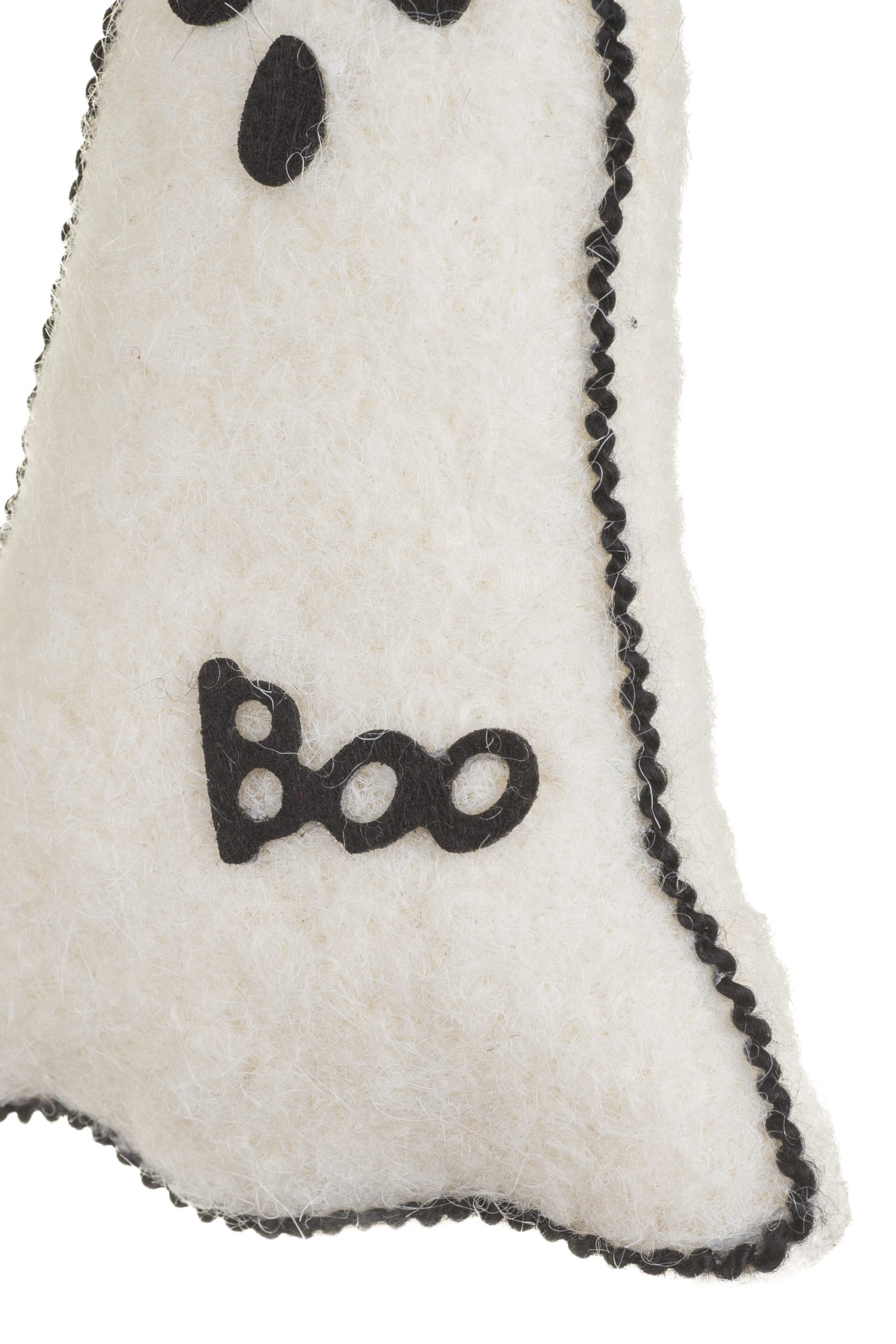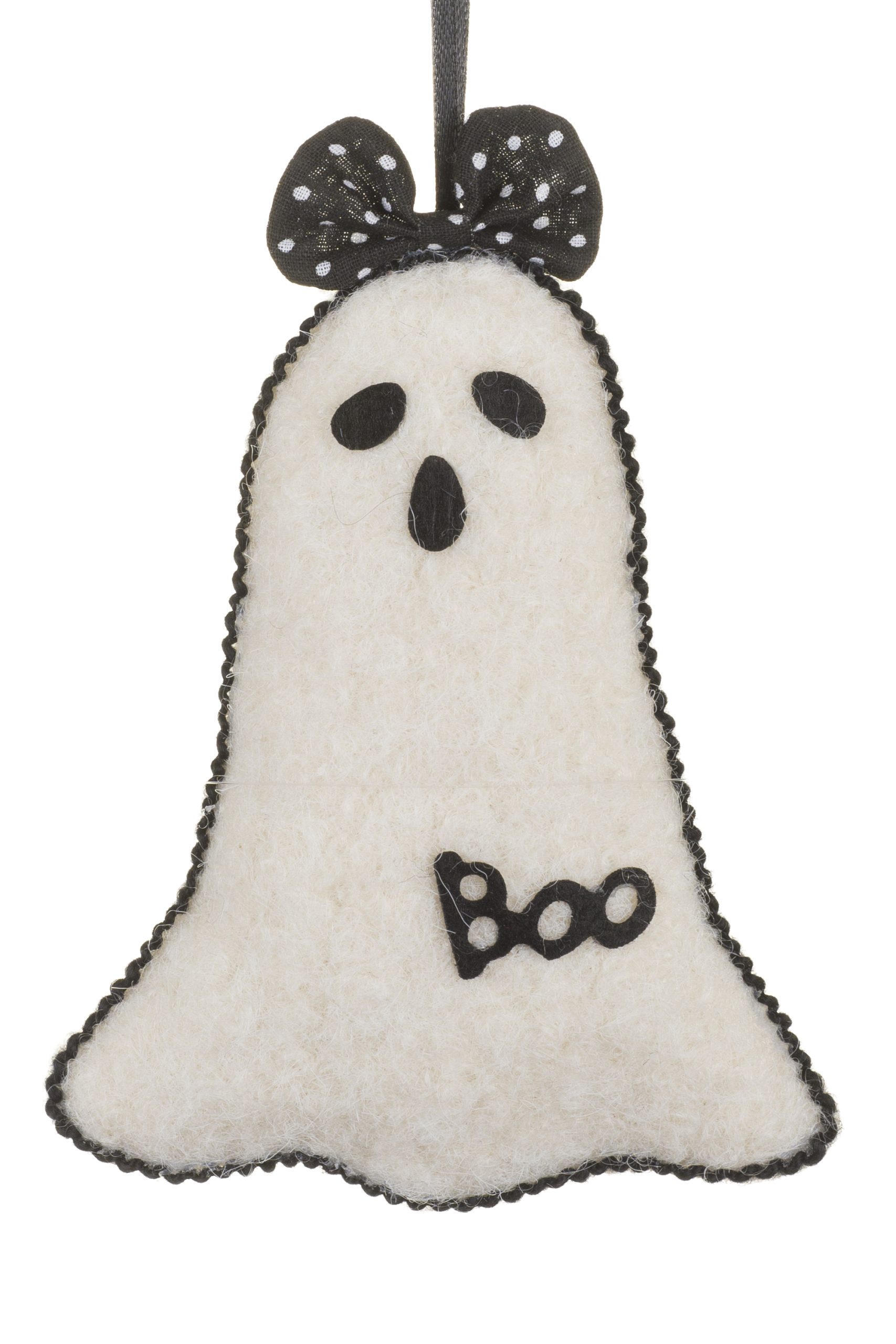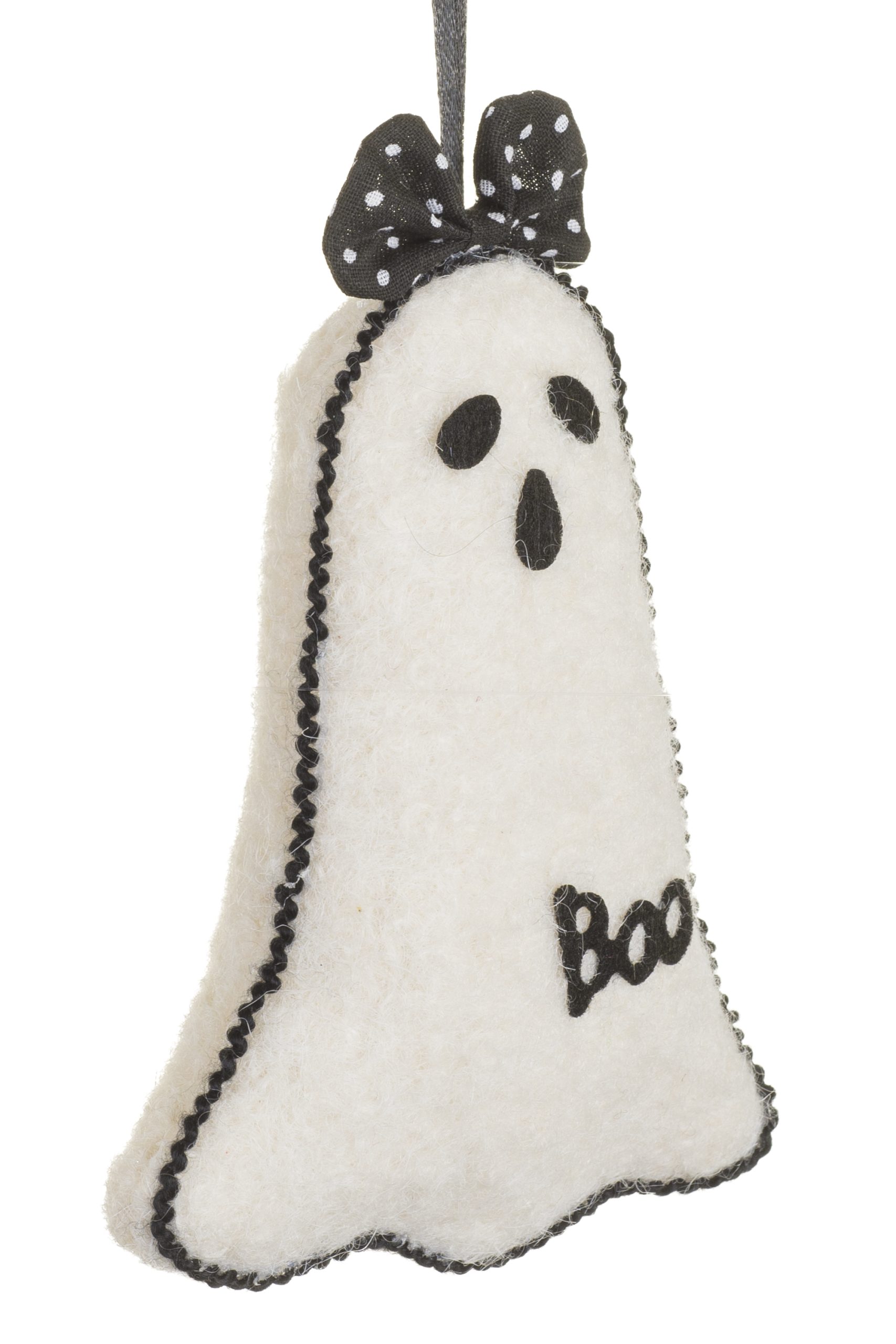 • Description: 6" Fuzzy Hanging White Fabric "Boo" Ghost Ornament with Bow