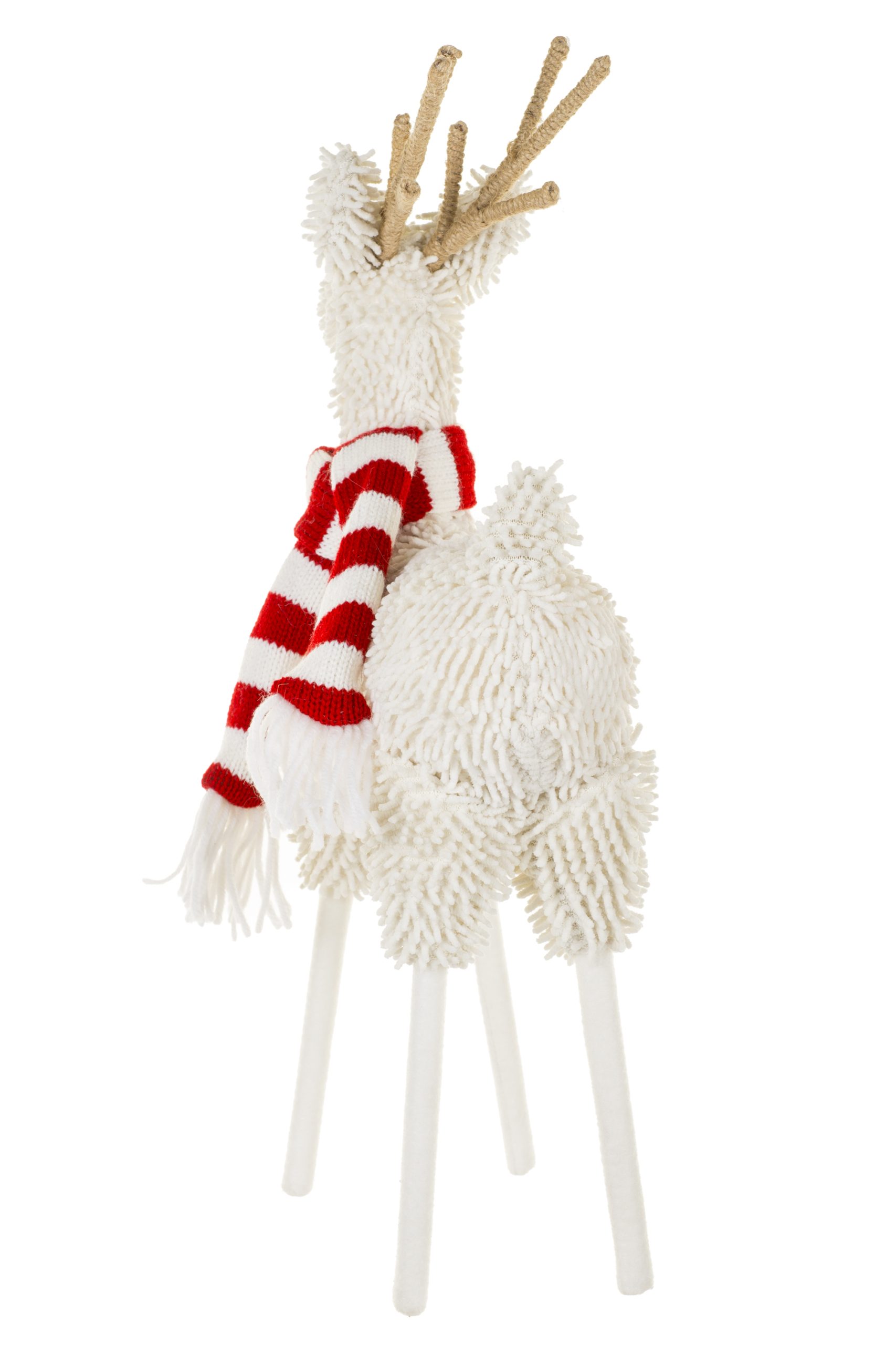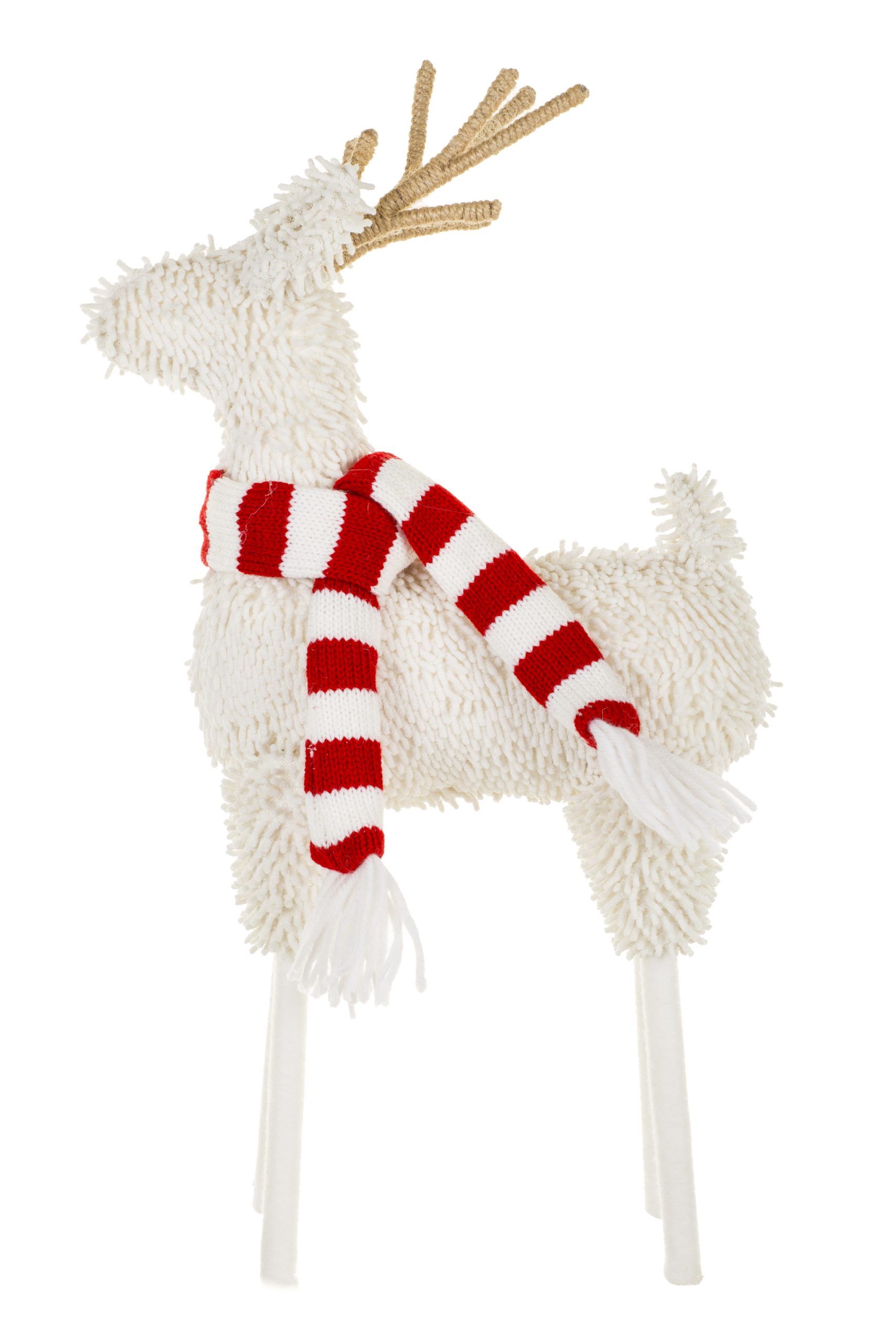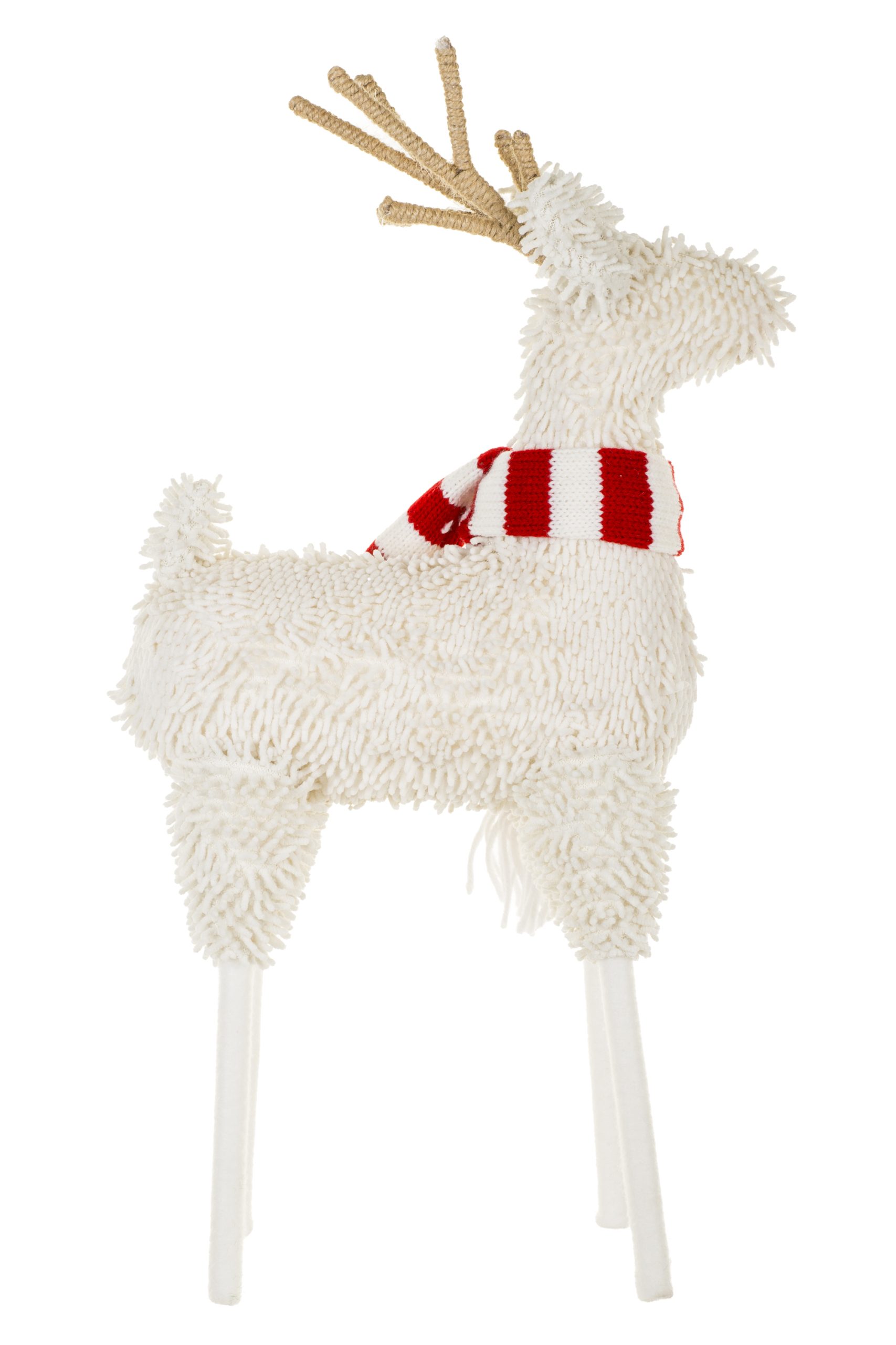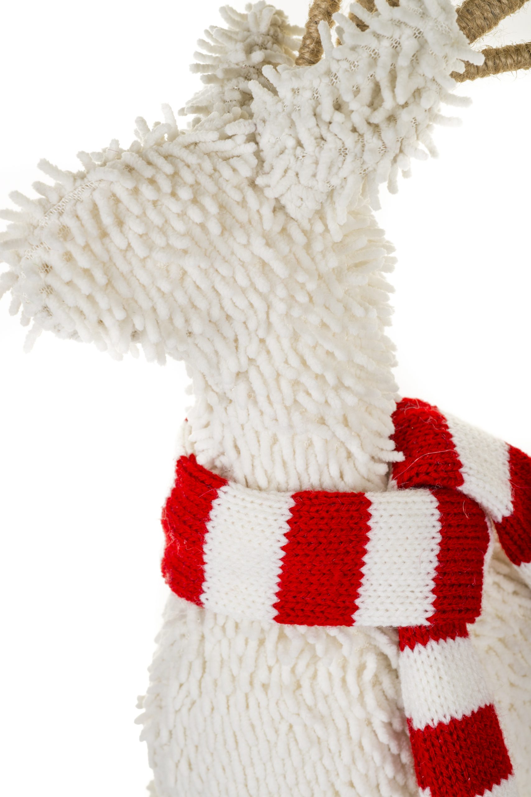 • Description: 19" White Fabric Chenille Reindeer Figurine with Red Striped Scarf & Rattan Horns