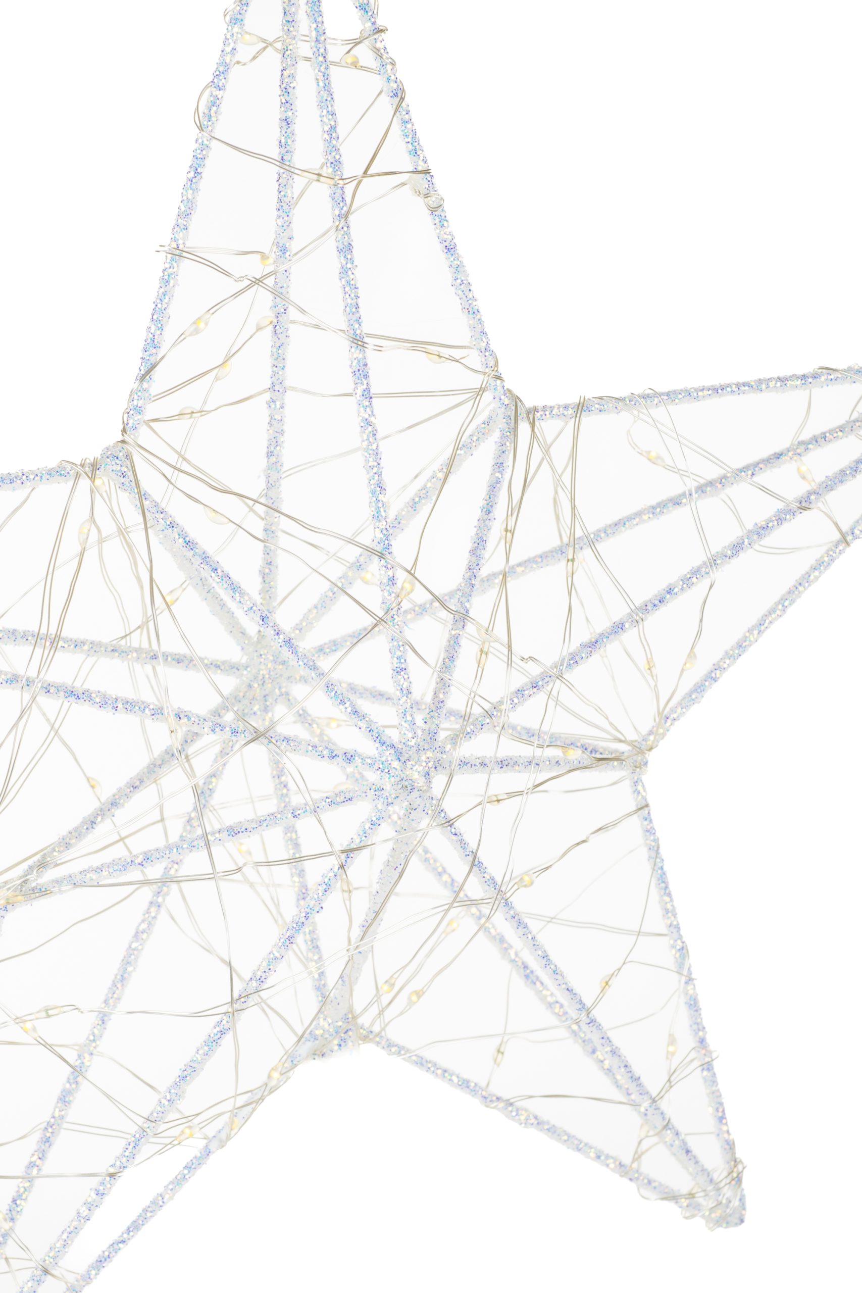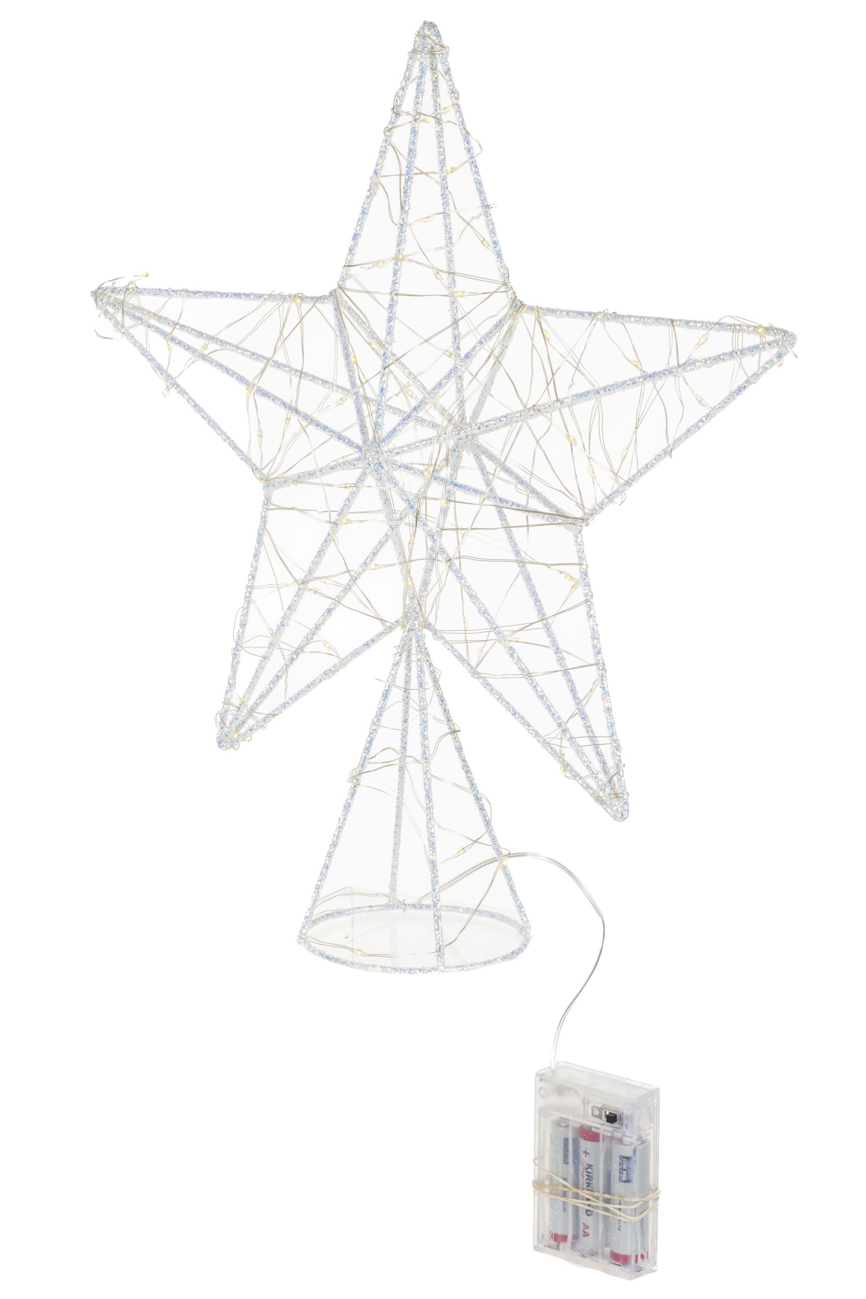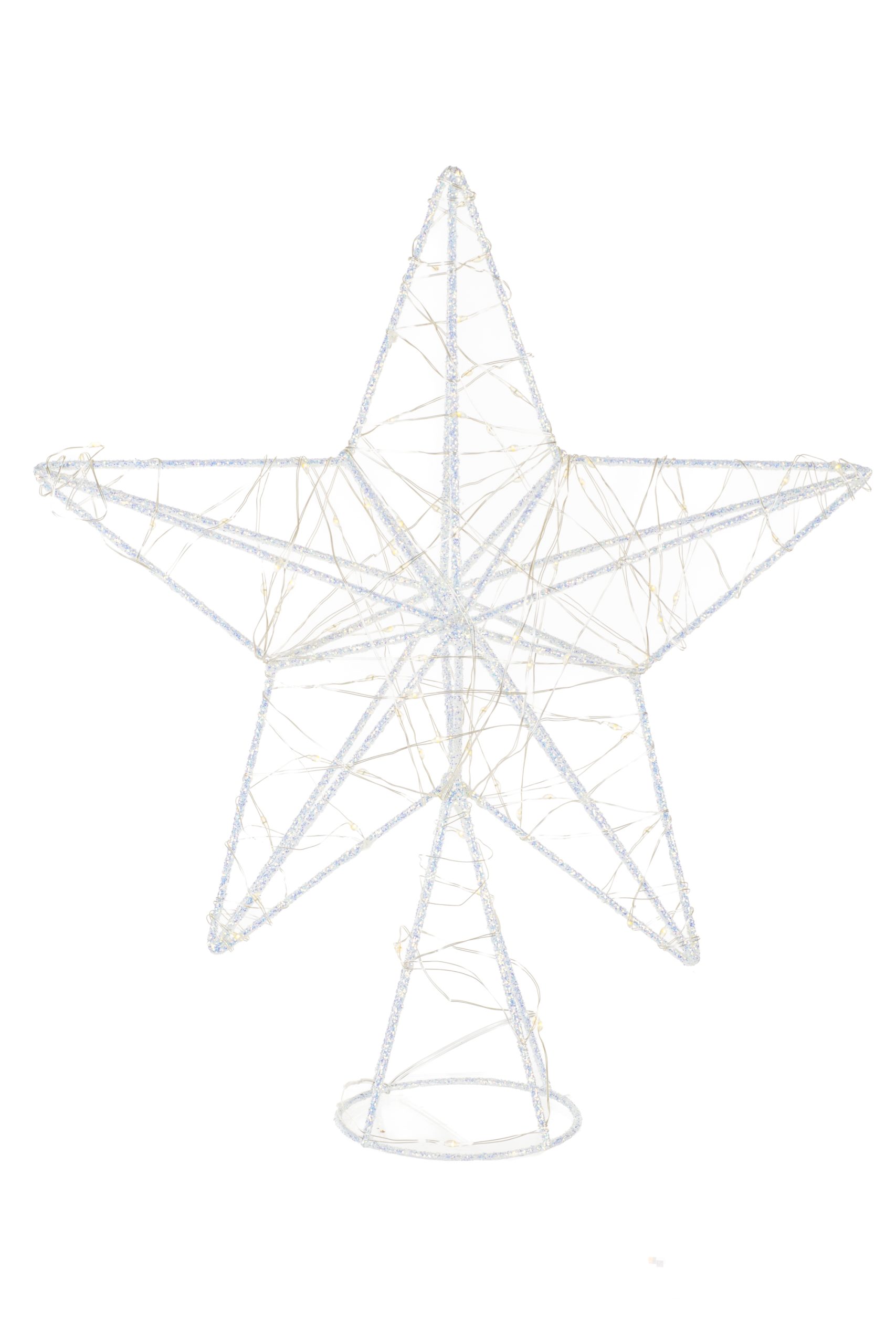 • Description: 14" White Metal Wire Five Pointed Warm White LED Star Tree Topper with Blue Accent Glitter