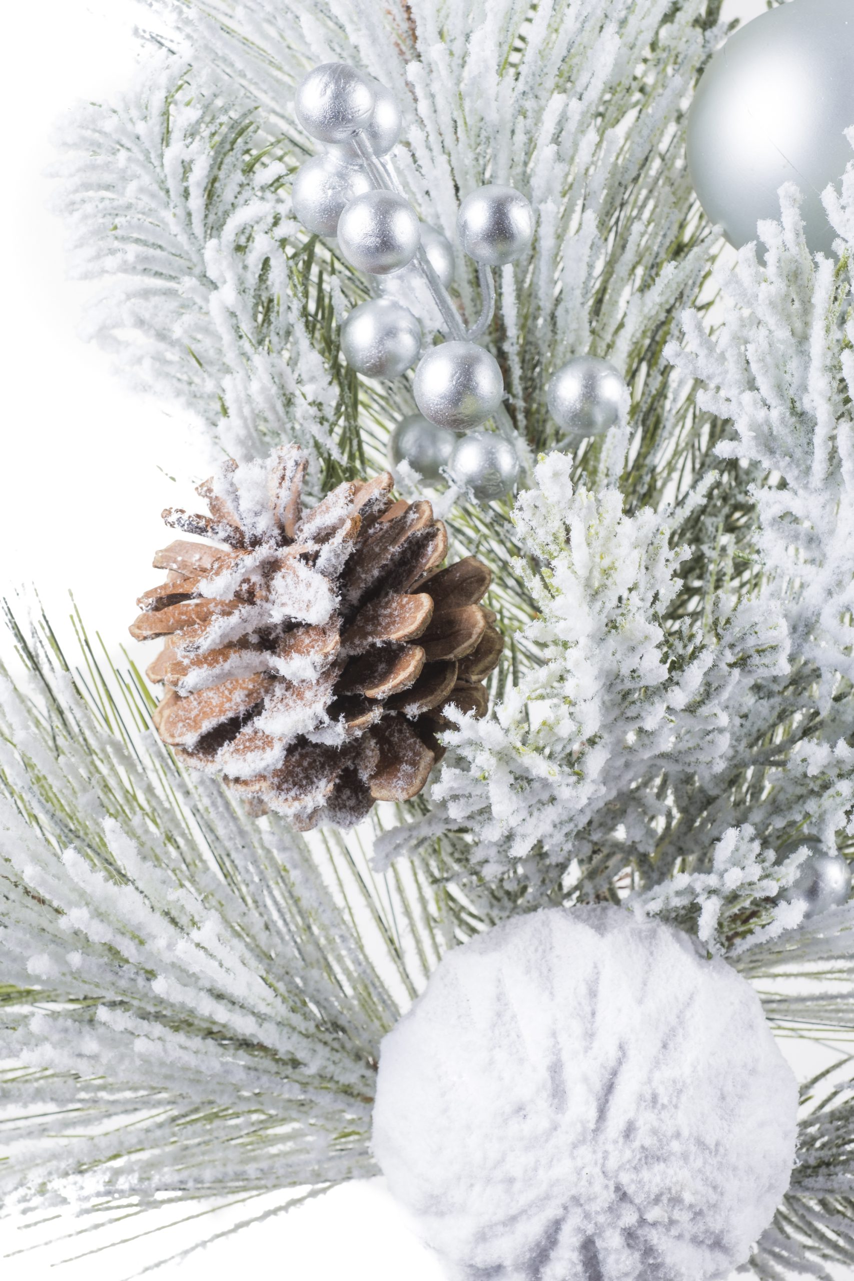 • Description: 24" Frosted White and Green Plastic Pine Tree Pick with Silver Baubles