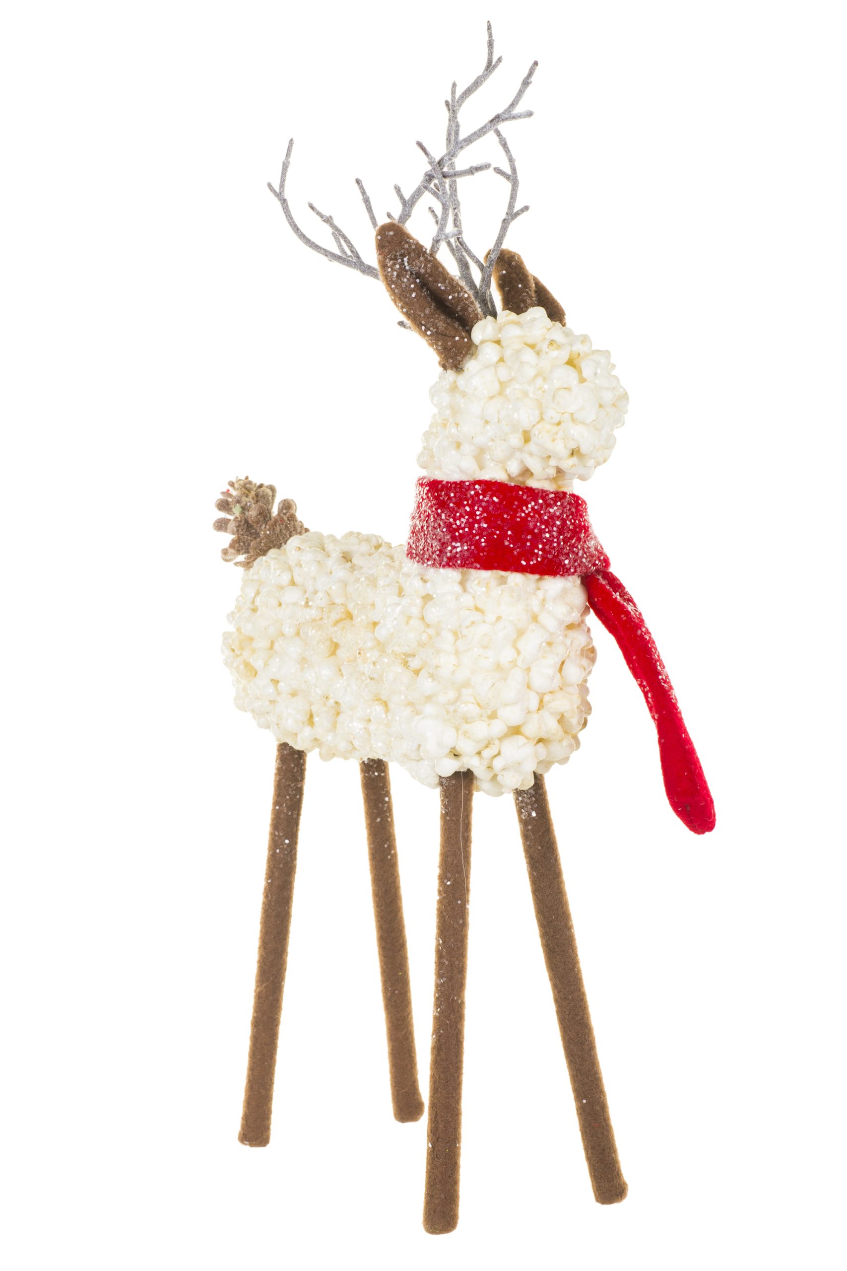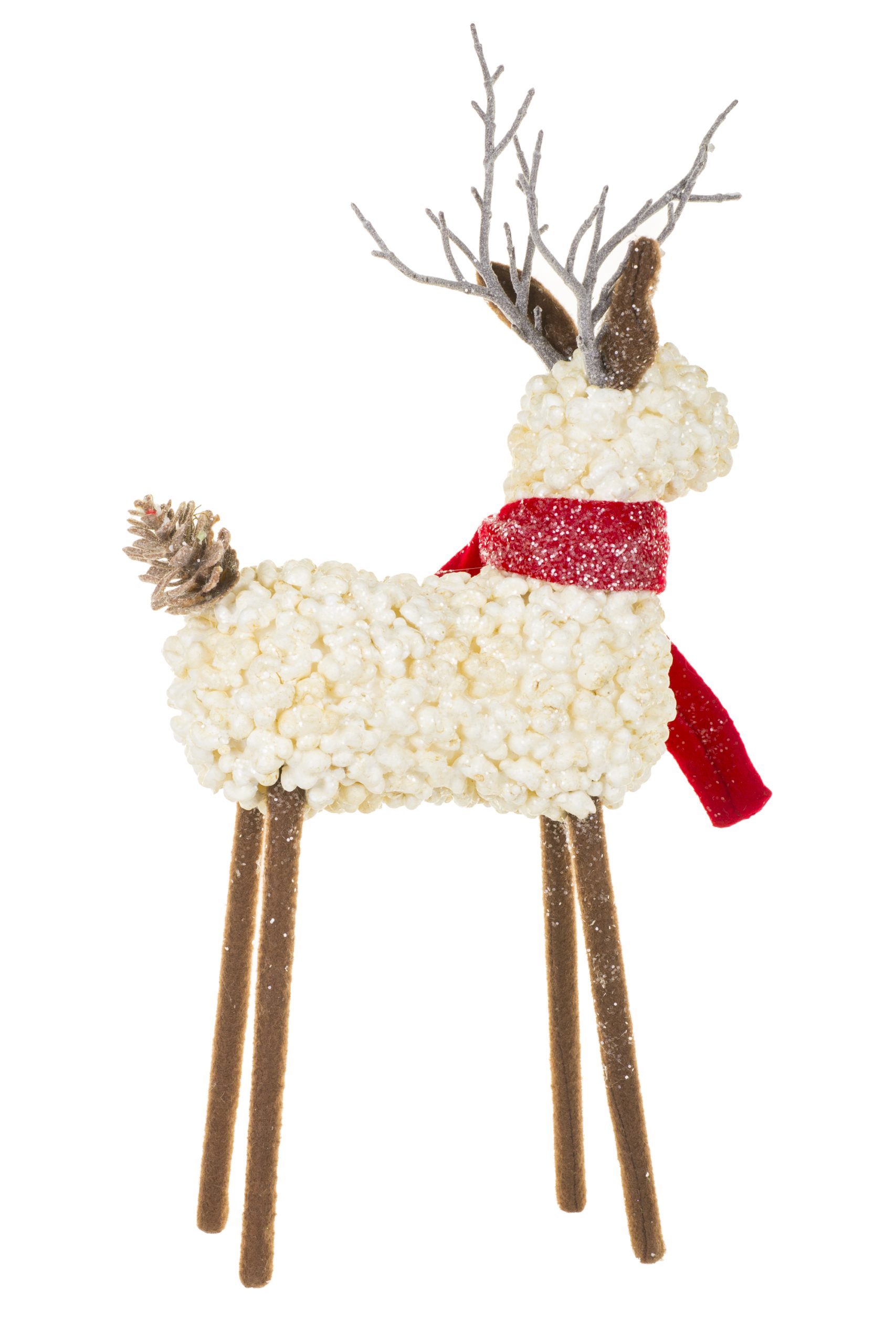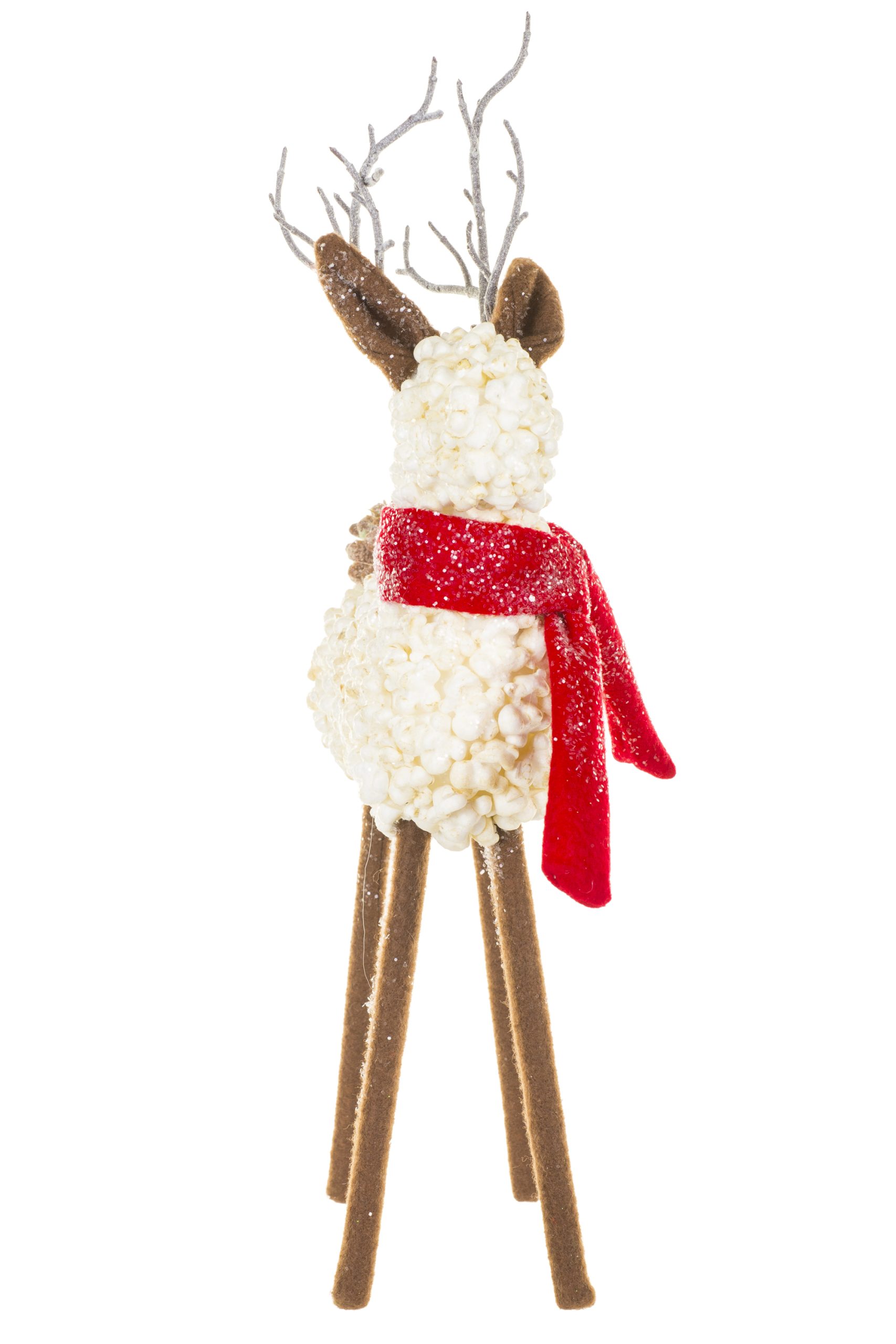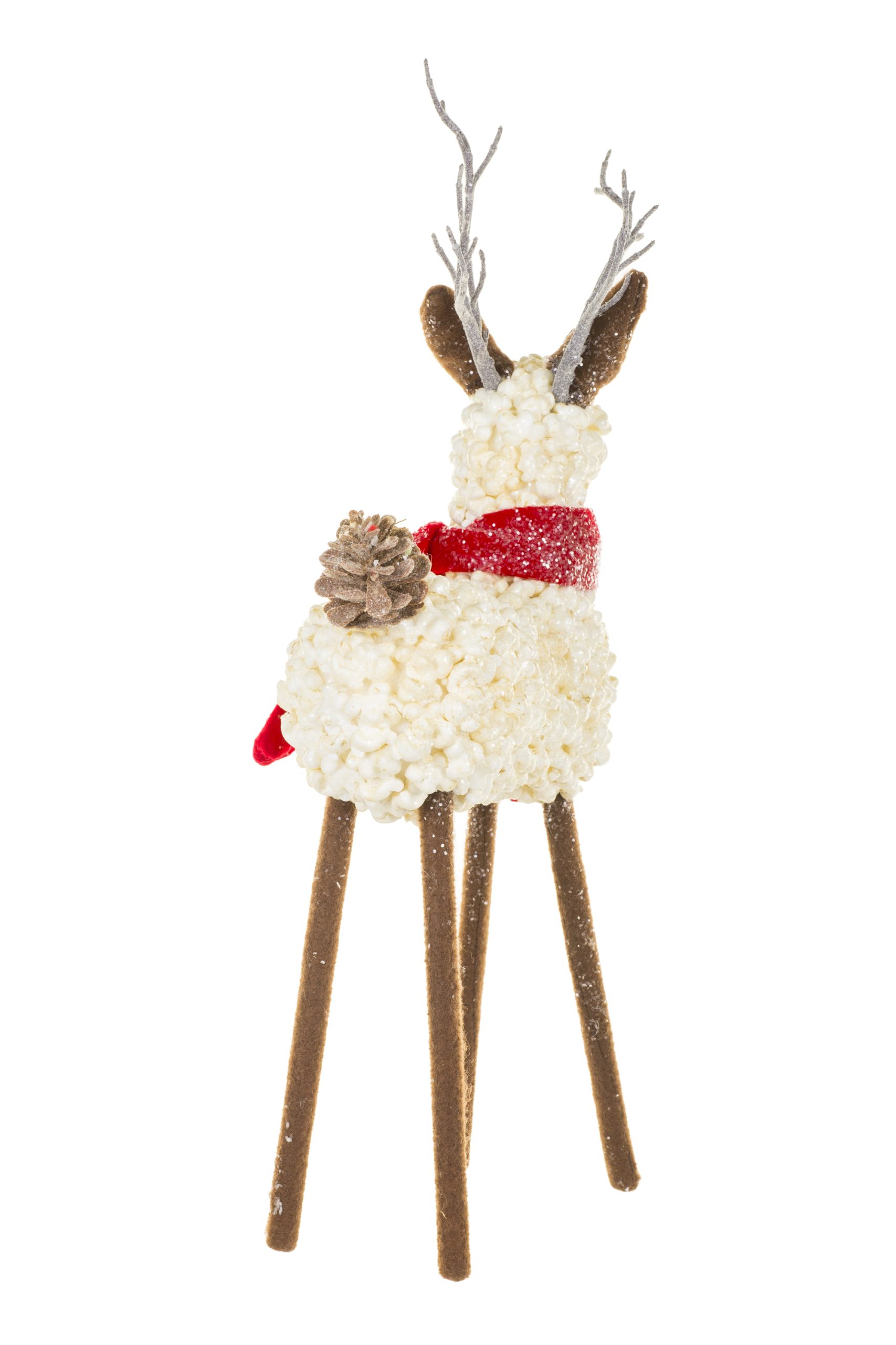 • Description: 19" White and Brown Foam Popcorn Reindeer Figurine with Red Scarf & Pinecone Tail