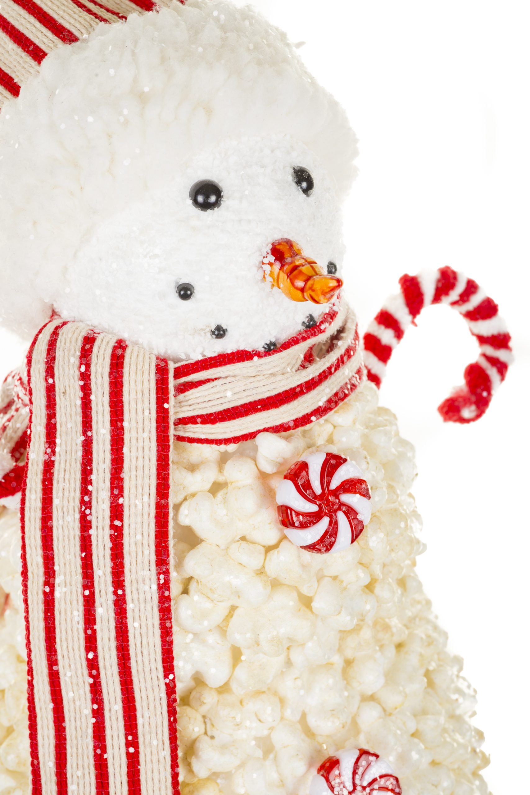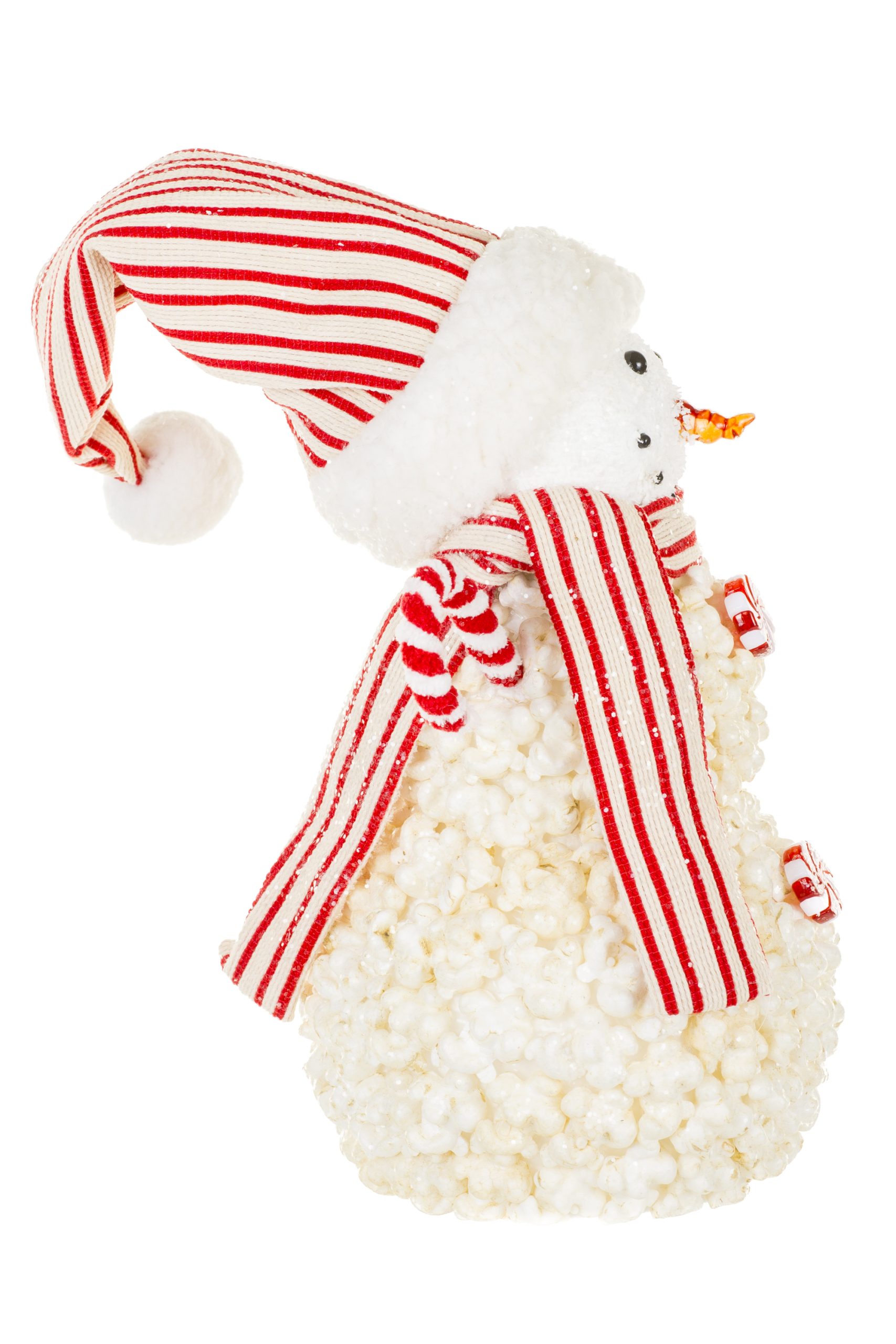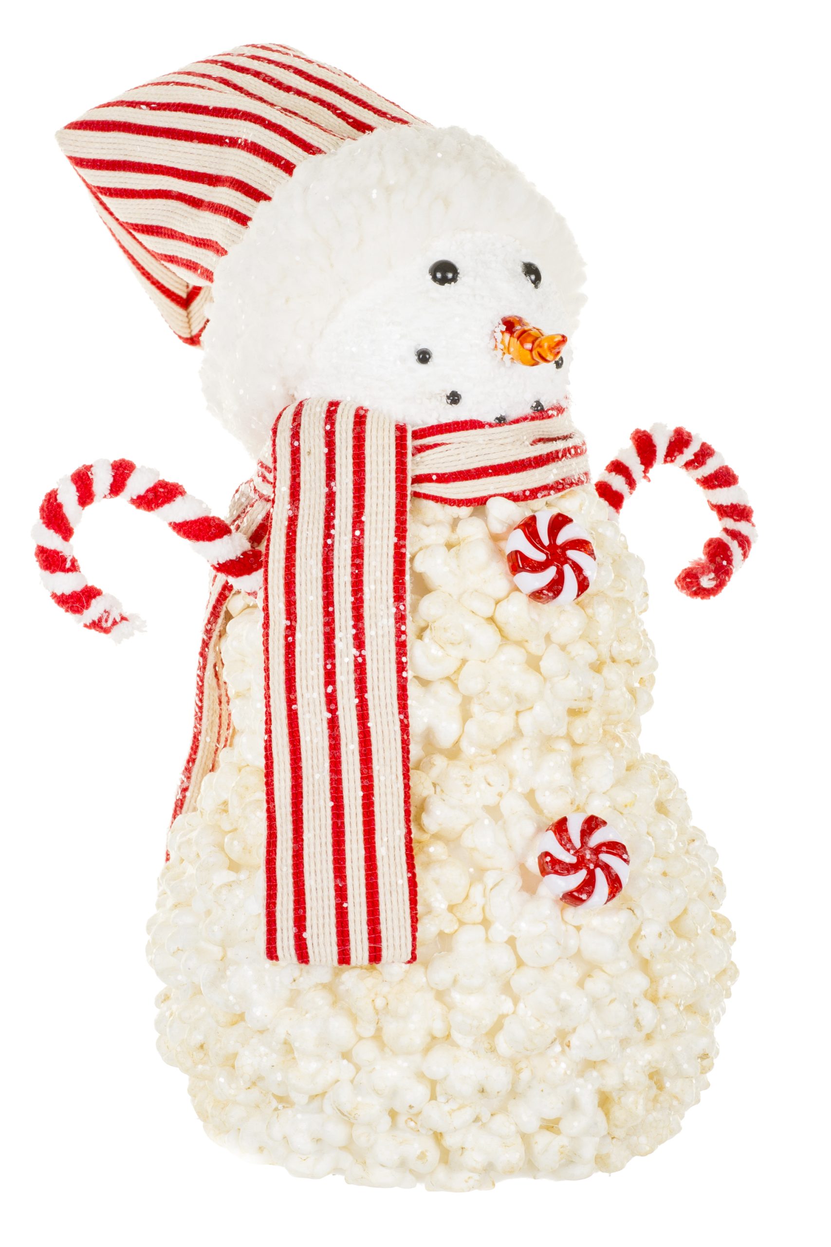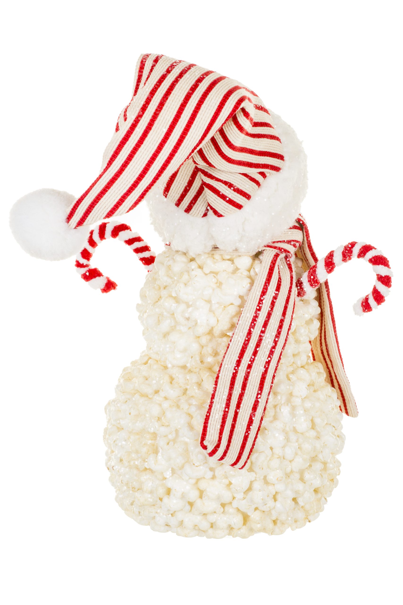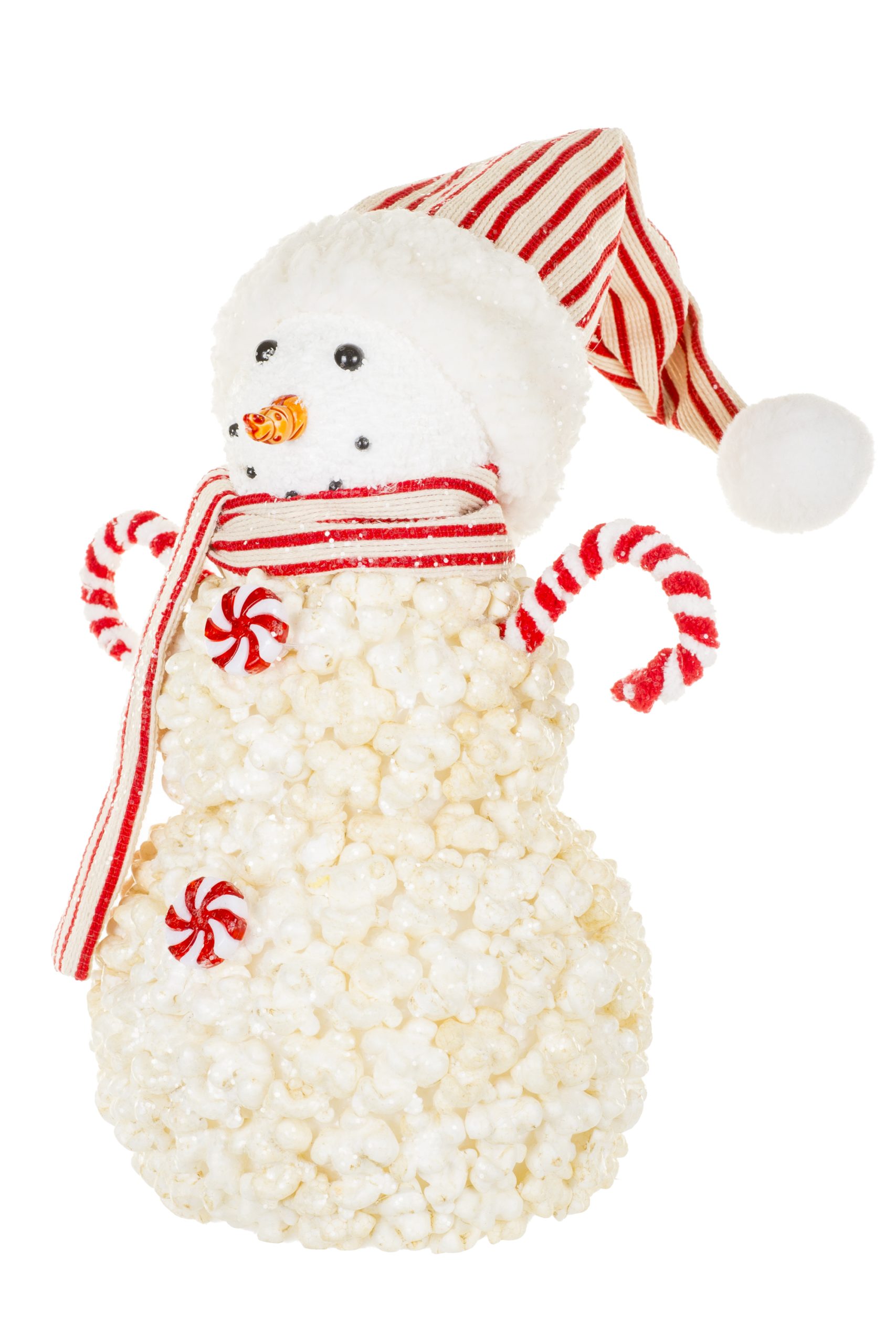 • Description: 10" Striped White and Red Foam Popcorn Snowman Figurine with Candy Cane Arms
