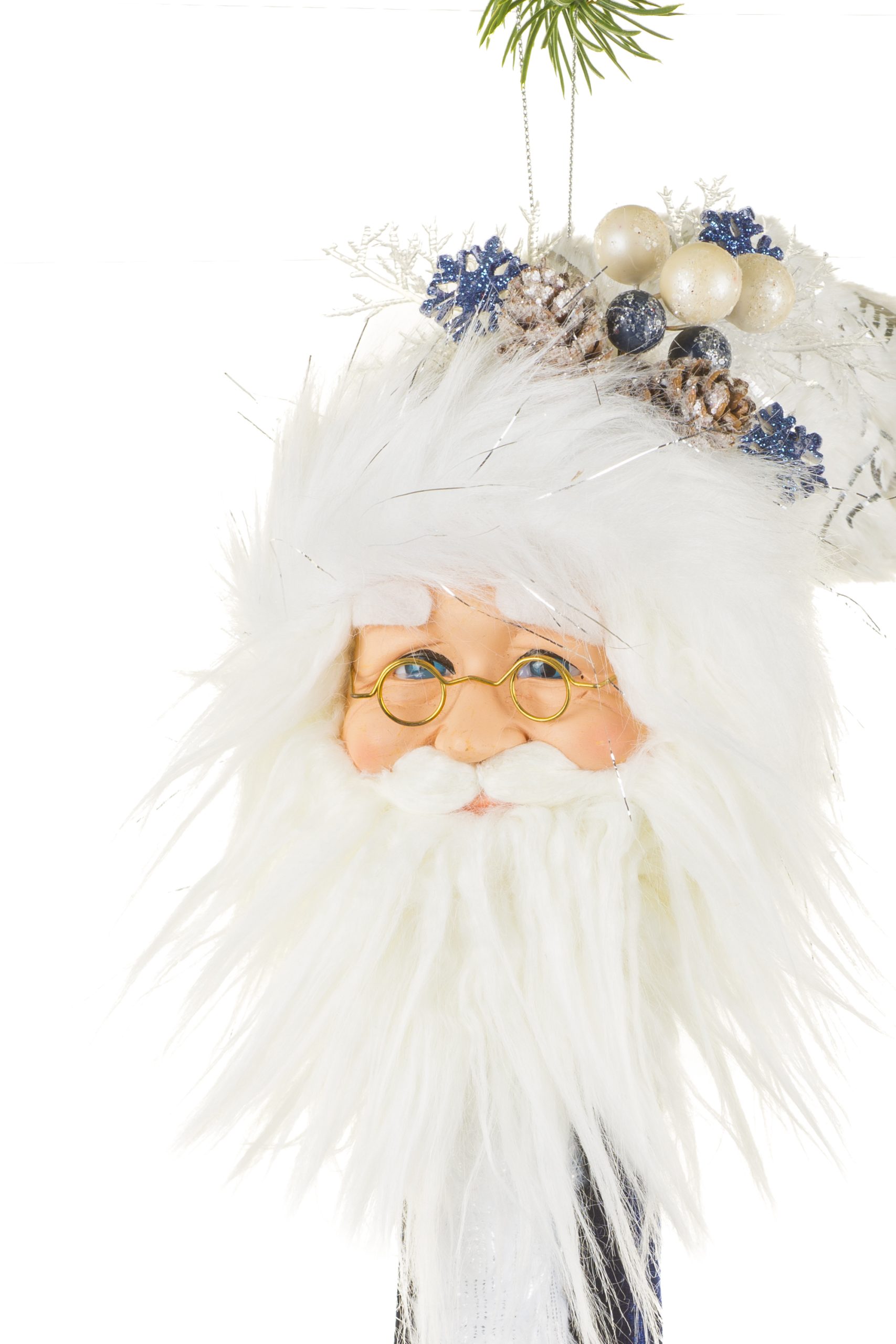 • Description: 15" White and Silver Fabric Santa Head Ornament with Ornamental Hat Pattern & Dangling Bells