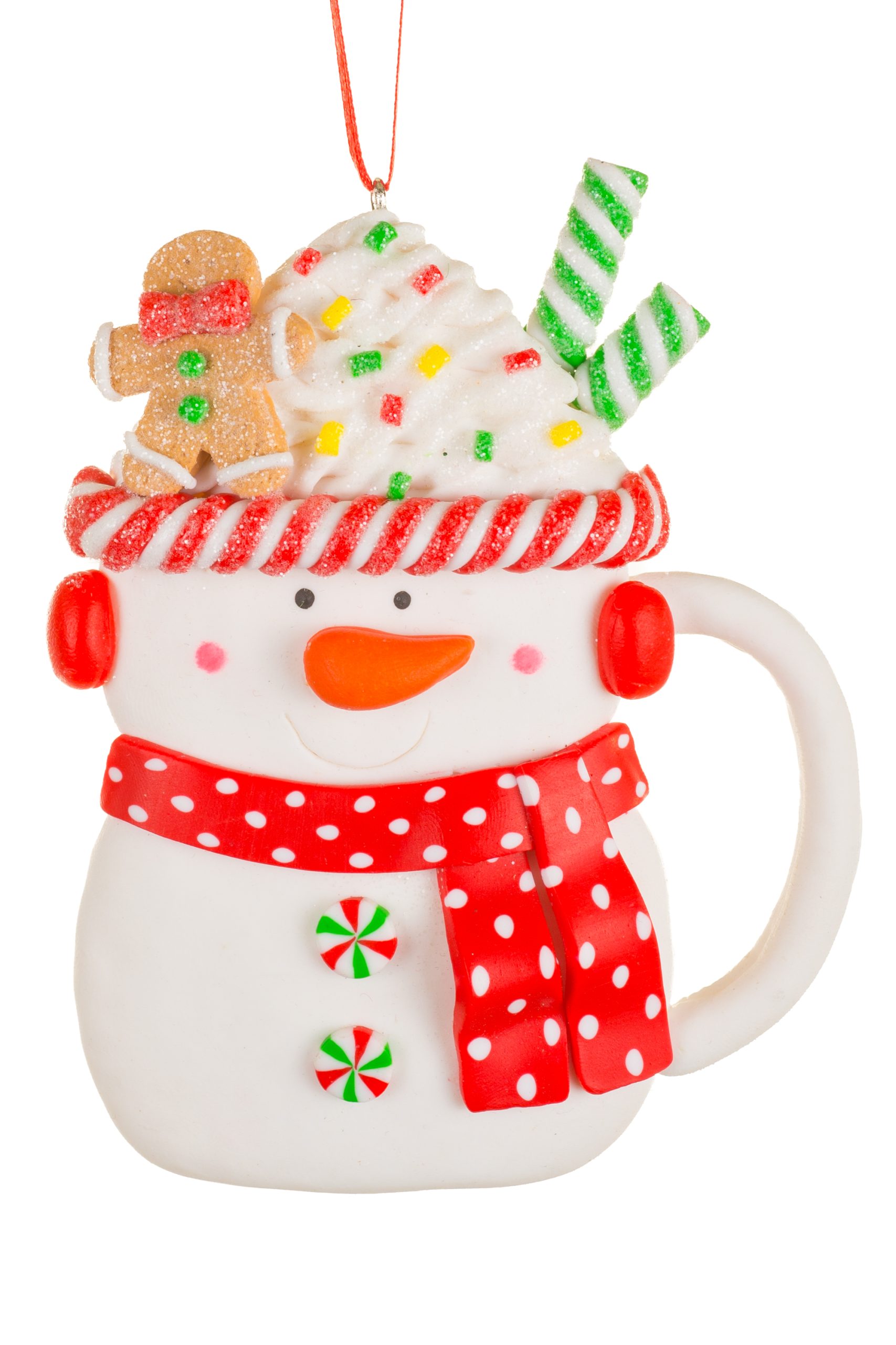 White Snowman Cocoa Mug Ornament With Candycane Straws