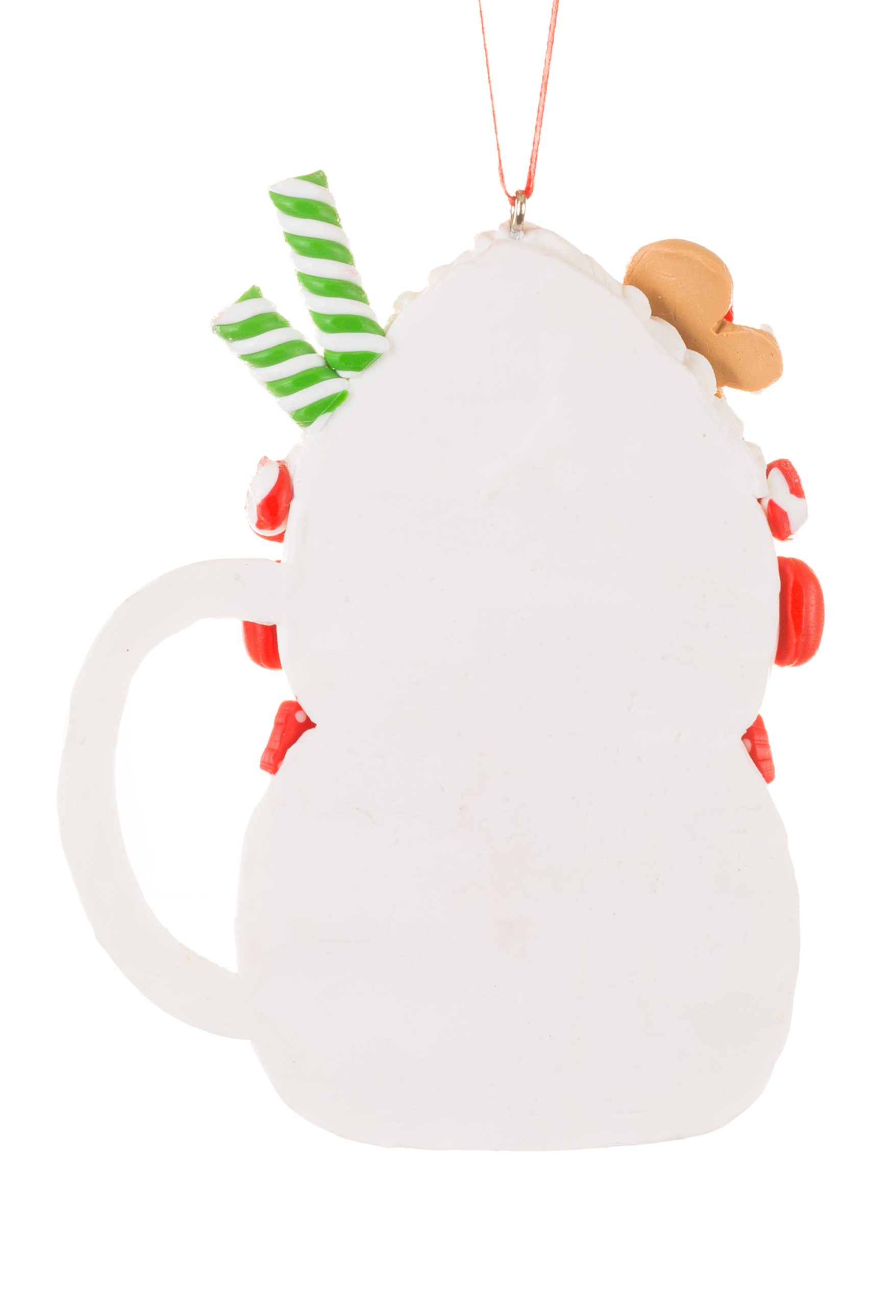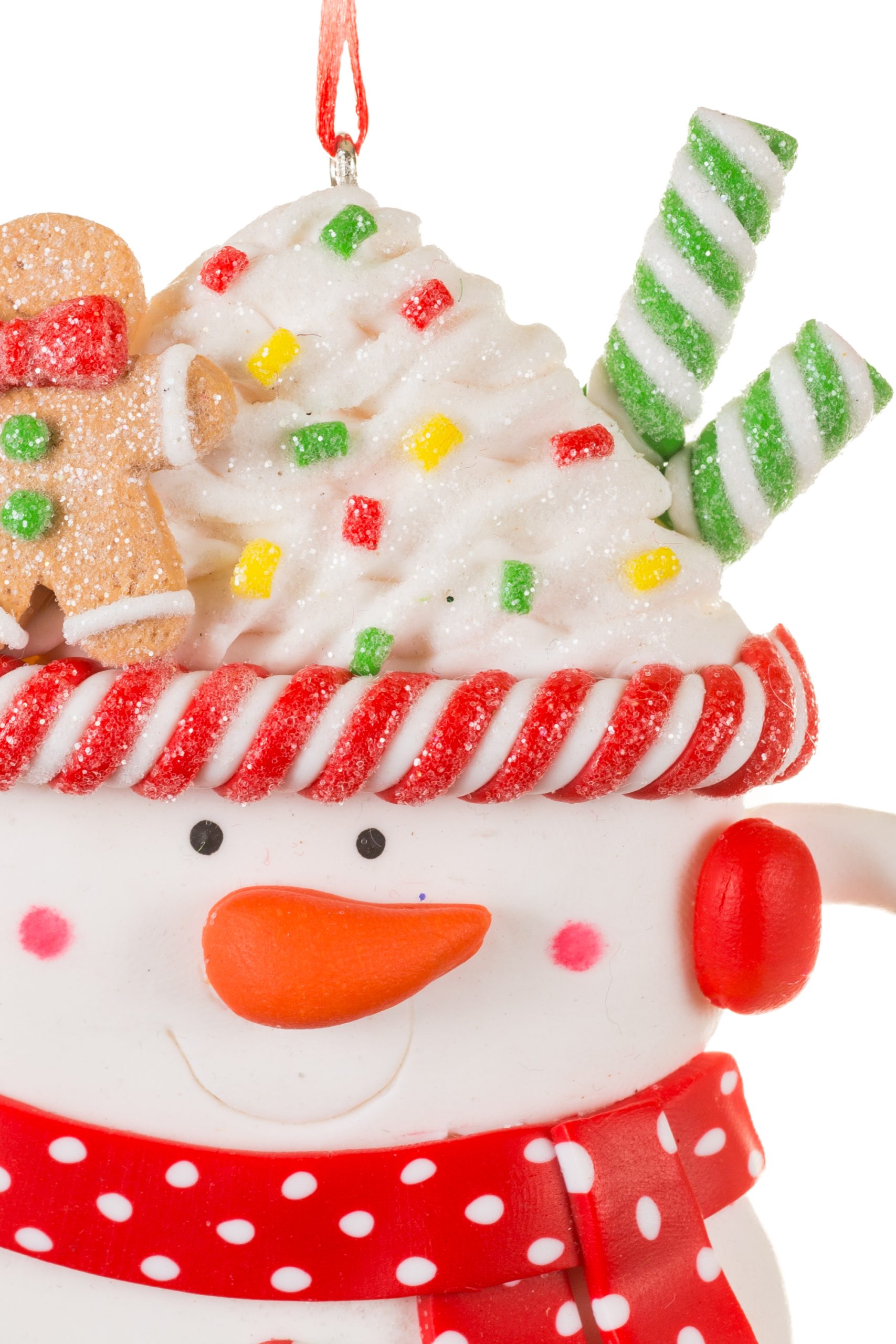 • Description: 5" Glittery Hanging White Acrylic Snowman Cocoa Mug Ornament with Candycane Straws