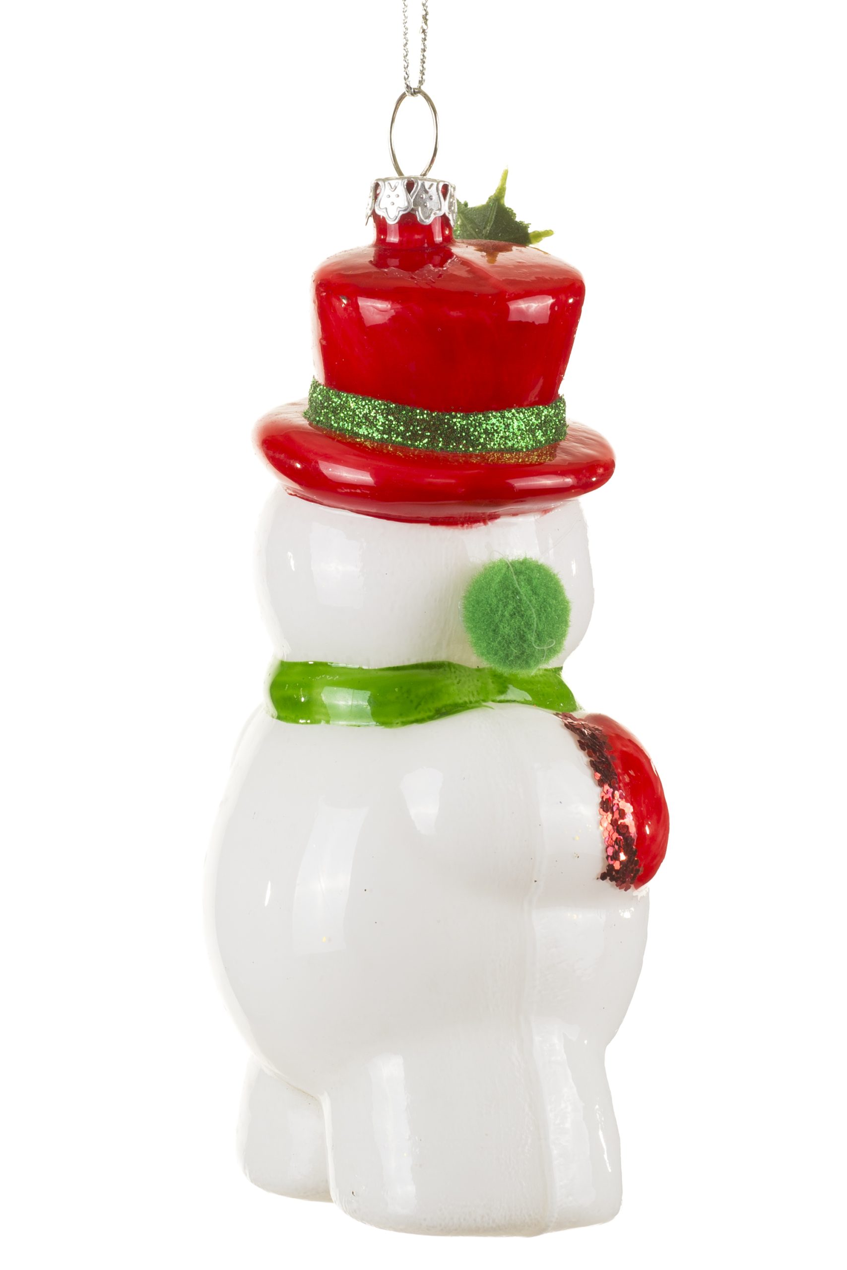 • Description: 5" Hanging White and Red Glass Snowman Ornament with Holly Jolly Hat