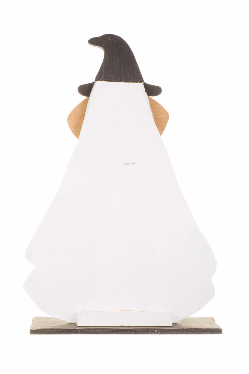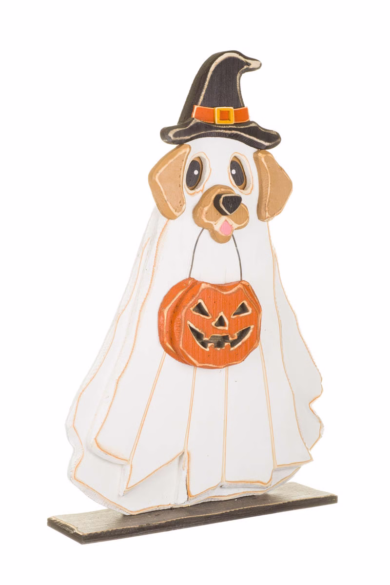 ? Description: 28.25" White Wooden Trick-Or-Treating Ghost Puppy Display with Witch Hat