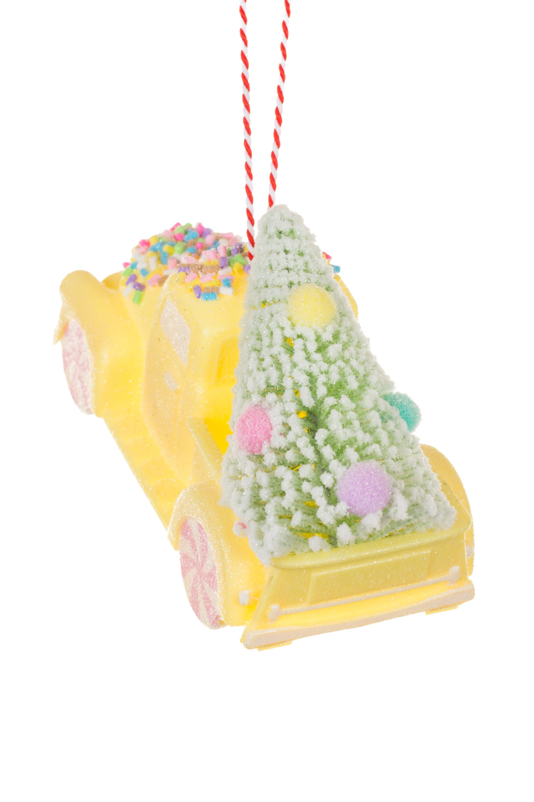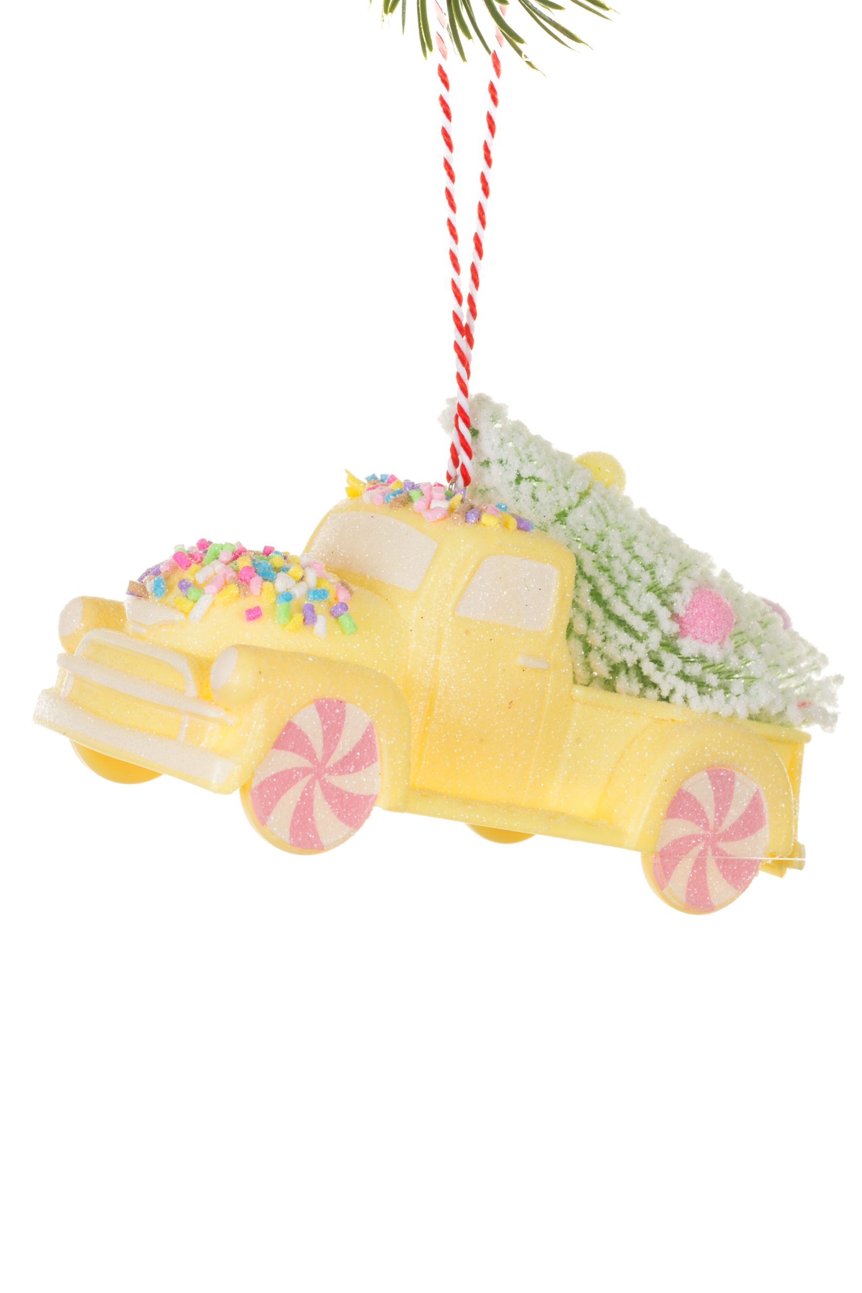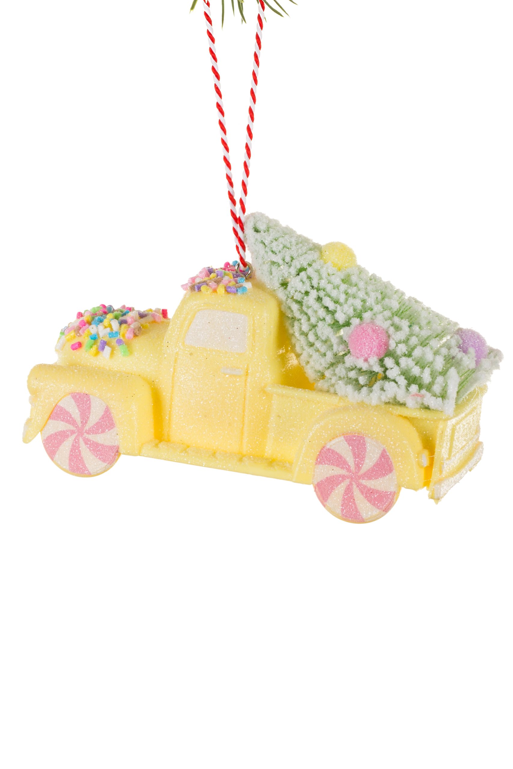 • Description: 4.75" Glittery Hanging Yellow Plastic Pickup Truck Ornament with Christmas Tree & Peppermint Wheels