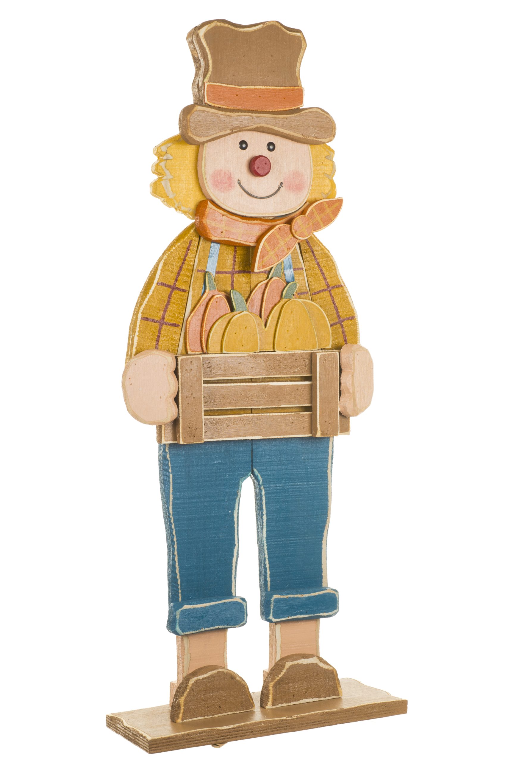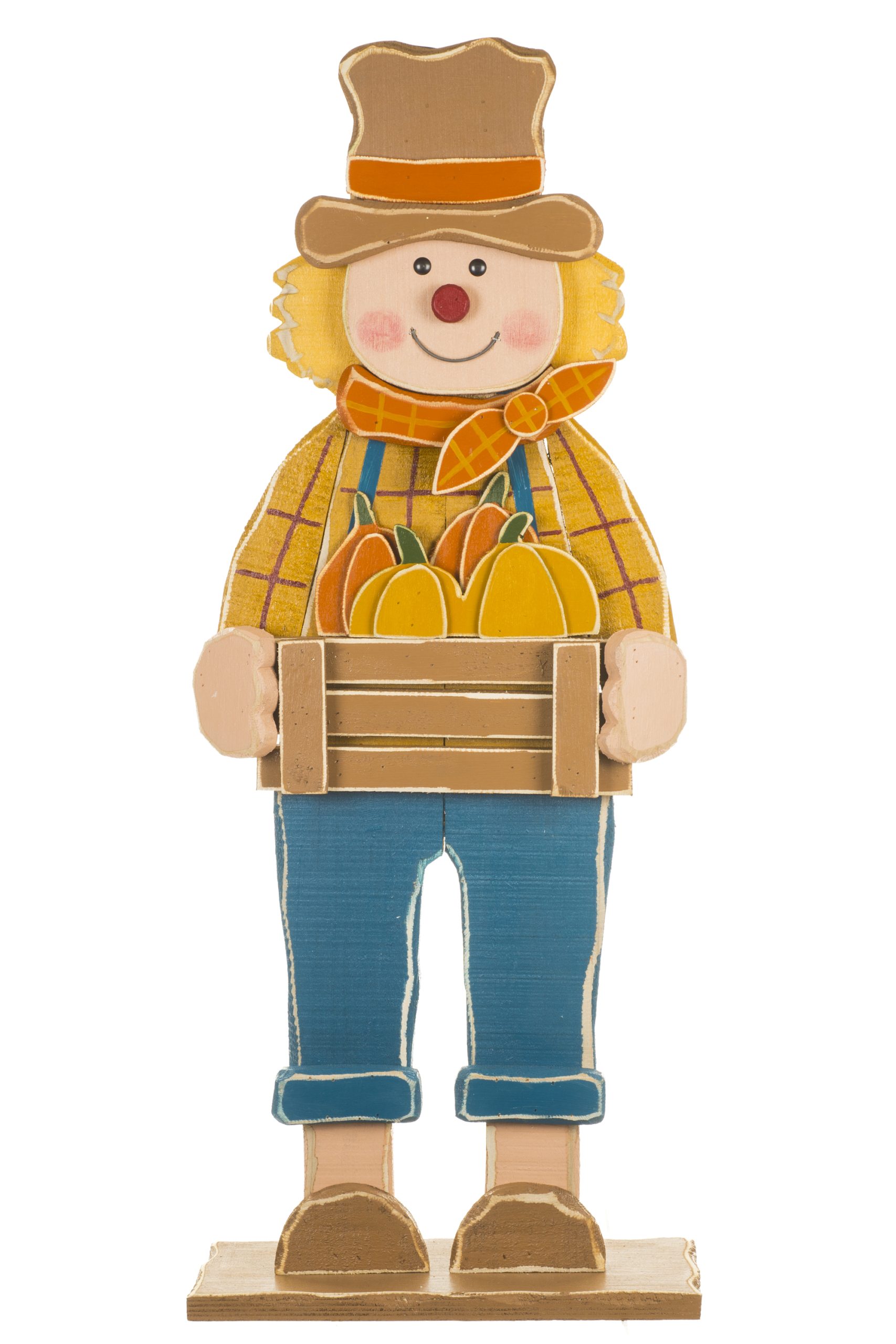 • Description: 33.46" Yellow and Blue Wooden Thanksgiving Farmer Display Figure Carrying Pumpkins